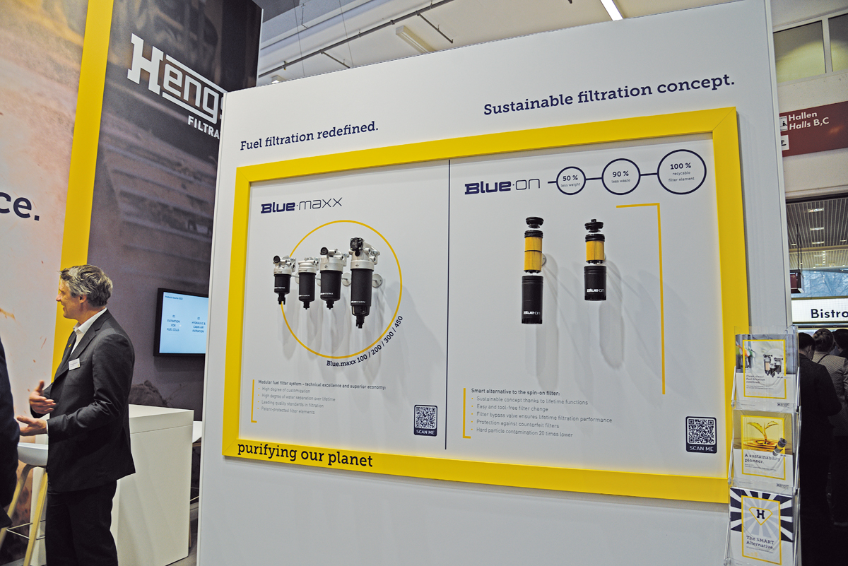 Im Bereich der Ölfiltration bietet Hengst sein nachhaltiges Filtrationskonzept Blue.on auch für Nutzfahrzeuge an. Dabei handelt es sich um eine Alternative zum Spin-on-Filter, die einen werkzeuglosen Wechsel mit 25 % weniger Gewicht und 90 % weniger Abfall ermöglichen soll. Spin-on-Filter sind vielfach im Einsatz, und bei jedem Filterwechsel wird hier die gesamte Filtereinheit komplett gewechselt, wenn nur das Filterelement getauscht werden müsste. Das Gehäuse mit den anderen Funktionen wird allerdings mit entsorgt und erzeugt jährlich Millionen Tonnen Abfall und damit eine enorme Umweltbelastung. Ein Recycling findet aufgrund der Vielzahl der verbauten Materialien meist nicht statt. Auch müssen die Spin-ons aufgrund der verbliebenen Restflüssigkeiten als Sondermüll entsorgt werden. Das Filtrationskonzept Blue.on besteht aus einem Deckel aus Kunststoff, einem Filterelement und dem Ventiladapter, wobei nur das Filterelement gewechselt werden muss und die restlichen Komponenten lebensdauerfest am Motor bleiben.