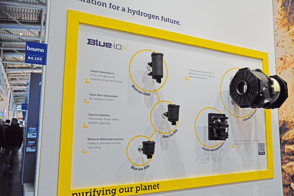 Brennstoffzellensysteme stellen insbesondere im Nutzfahrzeugsegment eine Schlüsseltechnologie für emissionssparende, nachhaltige Mobilität dar. Zu den Herausforderungen bei Brennstoffzellen zählt die Löslichkeit von ionischen Bestandteilen im Kühlmittelkreislauf. Der von Hengst jüngst entwickelte Ionentauscher Blue.iox verspricht eine minimale elektrische Leitfähigkeit des Kühlmittels, um damit Kurzschlusseffekte auszuschließen (das bauMAGAZIN berichtete in Heft 9/22, Seite 193).
