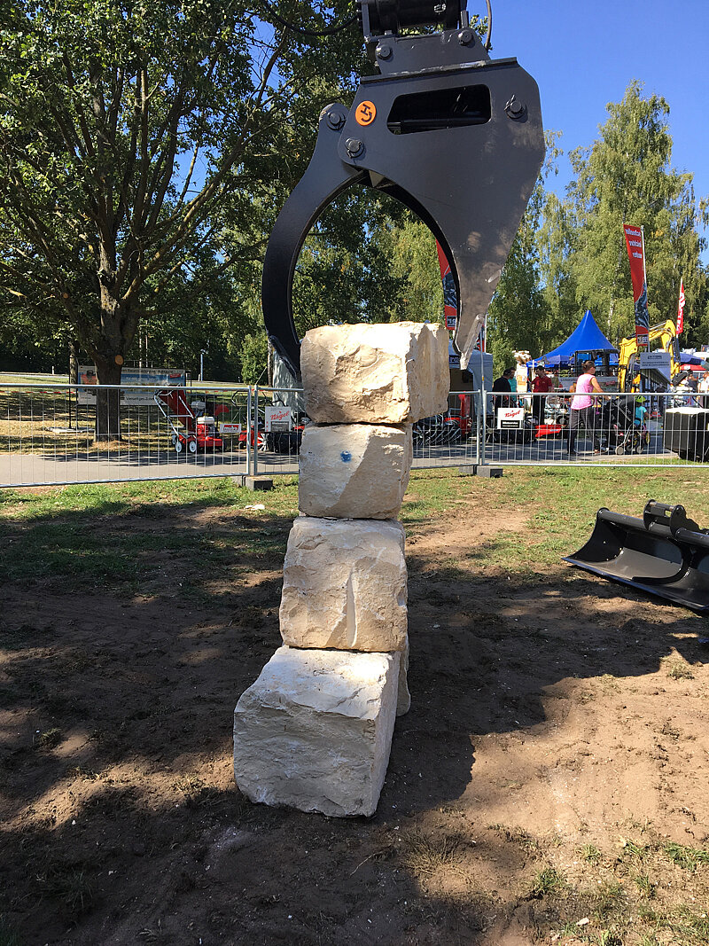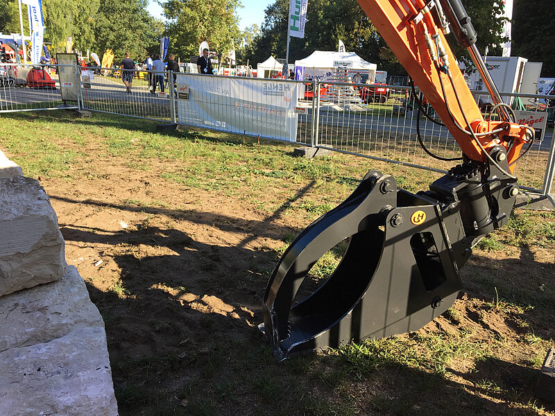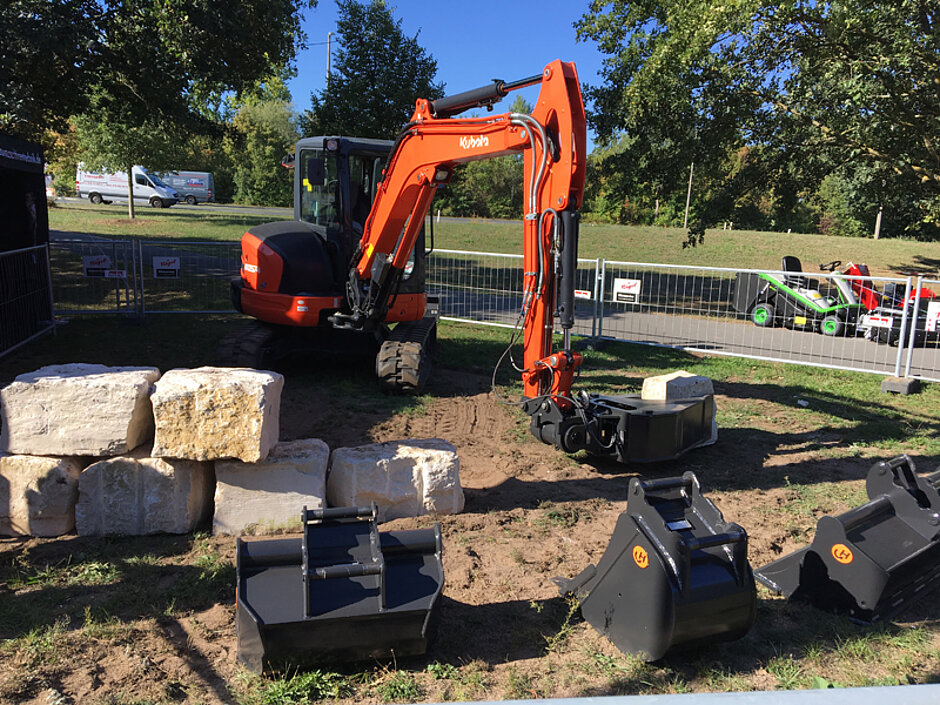 Neben dem Schnellwechslersystem stieß insbesondere das Sortiment für den Garten- und Landschaftsbaubereich auf Begeisterung bei den Besuchern. Der Greiftieflöffel, ein schmaler Löffel ergänzt durch einen hydraulischen Niederhalter, wurde auch im Freigelände in Aktion vorgestellt, um seine verschiedenen Einsatzbereiche aufzuzeigen. Er eignet sich zum Beispiel dazu, eine Mauer aus Natursteinen zu errichten und landschaftlich zu modellieren.