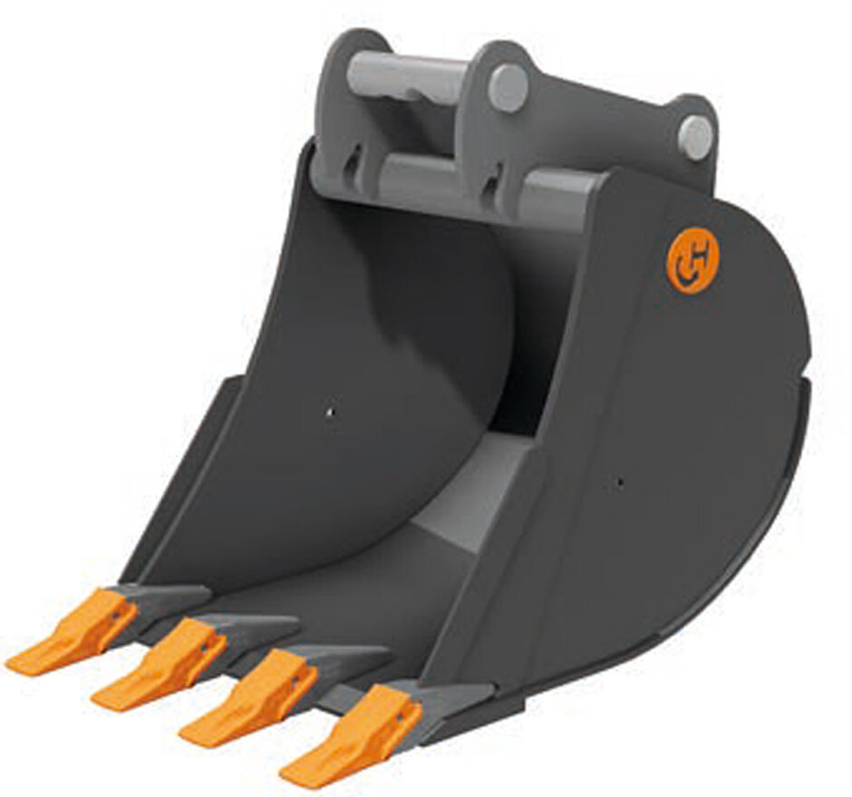 »Heavy Duty« steht für eine besonders hohe Verschleißfestigkeit. Der HD-Löffel ist aus diesem Grund aus hochverschleißfestem HB-400-Stahl gefertigt. Die Seitenteile des Löffels sind auf den Boden gestellt, um zusätzlich die Robustheit des Anbaugeräts zu erhöhen. Abgerun-det wird der Löffel durch ein geschweißtes Zahnsystem. Mit dem Blick auf den Kunden wurde hier die Produktlinie so erweitert, dass der Baggerführer vor Ort effizienter sein Ziel erreicht. Kunden bietet Henle die Wahl zwischen einem Anbaugerät für leichte bis mittelschwere Böden und einem weiteren für härtere Böden. So kann man sich individuell und gezielt für die eigene Situation ausrüsten und den Löffel wählen, der optimal für den eigenen Zweck von Nutzen ist.