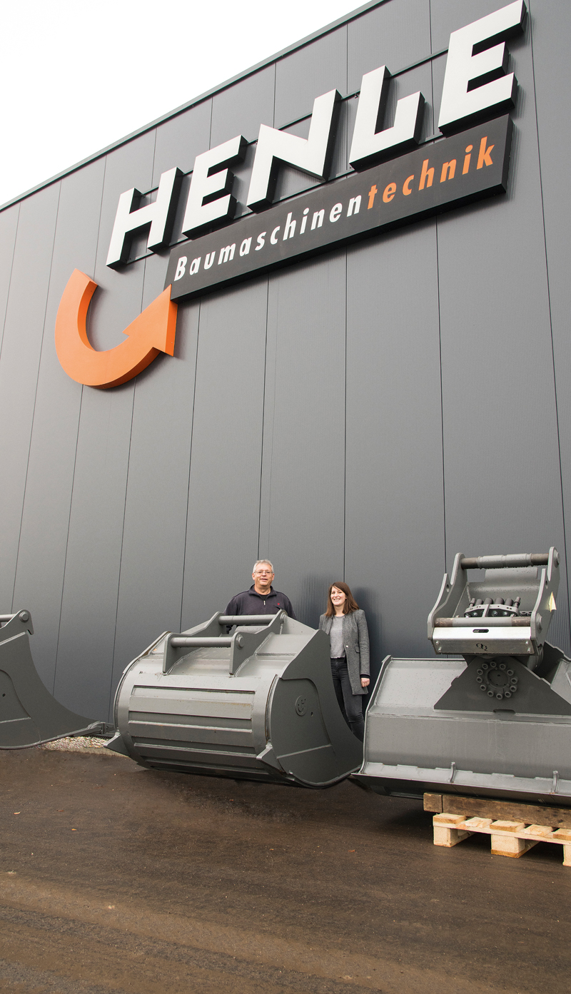 Wer sich zum Ende des Jahres mit Gerhard Henle und dessen für Marketing und Vertrieb zuständige Tochter Kathrin unterhält, der merkt schnell, dass 2019 für das von Gerhard Henles Vater Werner 1981 gegründete »klassische Familienunternehmen« mit insgesamt 103 Mitarbeitern ein sehr arbeitsintensives Jahr gewesen ist. So wurde nicht nur die 2 000 m² große neue Produktionshalle für die Serienfertigung von Anbaugeräten für den Kompaktmaschinenbereich fertig gestellt und in Betrieb genommen, sondern auch ein zweiter Schweißroboter angeschafft sowie das 700 m² große neue Verwaltungsgebäude bezogen und ein neues Computersystem installiert.