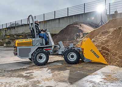 Der Senkmuldenkipper »SMK 9036« überzeugt laut Unternehmen durch seine Vielseitigkeit und macht räumlich beschränkte Baustellen deutlich produktiver. Er eignet sich nicht nur für den Transport von Materialien, sondern auch optimal zum Verfüllen und Planieren sowie zum Aufnehmen und Handling von Schüttgut. Die leistungsstarke Muldenkinematik ermöglicht ein schnelles, präzises Ablegen und wiederaufnehmen – selbst unter engen Platzverhältnissen. Die hohe Schubkraft und die Selbstladefunktion machen die Maschine aus Sicht von Paus »zum einzigartigen Multitalent auf jeder Baustelle«. Die Maschine kombiniert die Transportfähigkeit eines Dumpers mit der Selbstladefunktion eines Radladers und schafft so ein Multitalent für den Einsatz auf jeder Baustelle.d