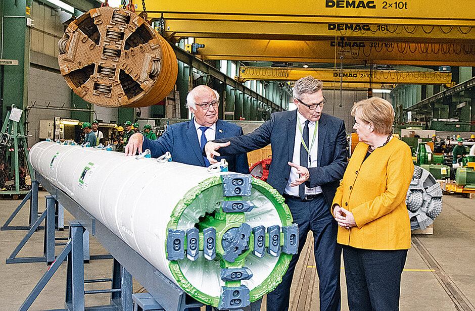 Im Anschluss an den Werksrundgang hielt die Bundeskanzlerin vor 200 Gästen eine Ansprache und ging auf Themen wie den Fachkräftemangel, die Beschleunigung von öffentlichen Planungs- und Genehmigungsverfahren sowie Investitionen in Forschung und Innovationen ein. Vorstandsvorsitzender Martin Herrenknecht dankte der Kanzlerin für ihren Besuch und betonte, welch‘ hohen Stellenwert die aktive Rückendeckung der deutschen Kanzlerin und der Bundesregierung bei den derzeitigen herausfordernden Markt- und Wettbewerbsbedingungen für Familienunternehmen, den Mittelstand, die Region und die über 5 000 Herrenknecht-Mitarbeitern hat. t