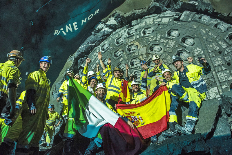 Per Livestream verfolgten am 11. September rund 25.000 Zuschauer weltweit die eng aufeinanderfolgenden Durchbrüche zweier Herrenknecht- Schwestermaschinen, „Queen Eufemia“ und „Queen Ellisiv“. Nicht nur für den Bauherren Bane NOR und das Joint Venture Acciona-Ghella war das ein historischer Tag. Auch die norwegische Tunnelbranche erlebt mit dem Einsatz von insgesamt vier Herrenknecht-Tunnelbohrmaschinen (TBM) beim Großprojekt Follo Line eine Premiere. Es ist ein Vorstoß maschineller Vortriebstechnik in ein Land, in dem traditionell der konventionelle Tunnelbau dominiert. Doch Anne Kathrine Kalager, Projektleiterin bei Bane NOR ist sich sicher: “TBM werden künftig in Großprojekten eine realistische Alternative sein, sogar in unserem extremen Hard Rock.” Die vier TBM mit Durchmessern von je 9.900 mm bohren sich seit Ende 2016 insgesamt durch rund 36 Kilometer knallharten Gneis. Die Eisenbahnstrecke Follo Line, mit einer Gesamtlänge von 22 Kilometern, soll im Dezember 2021 fertiggestellt werden. Auf 20 Kilometern wird die Strecke im Untergrund gebaut. Ein Großteil davon mittels maschineller Vortriebstechnik – genauer: 18,5 Kilometer.
