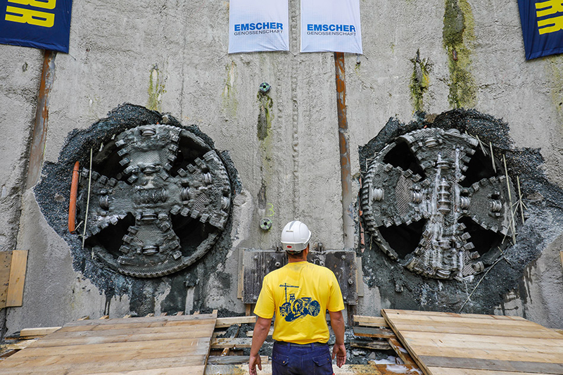 Mit dem Durchbruch der zwei 10 Kilometer langen Hauptsammlerstrecken des Bauabschnitts 40 in Oberhausen sind die Vortriebsarbeiten für den Bau des Abwasserkanals Emscher erfolgreich abgeschlossen. Die beiden von der Baufirma PORR eingesetzten EPB-Schilde (Ø 3.397 mm) erzielten mit Unterstützung von Herrenknecht-Service-Experten zwischen Oktober 2014 und Juni 2017 echte Spitzenleistungen. Die Baustellencrews vollbrachten dank starkem Teamwork das Kunststück, die durchschnittliche Maschinenverfügbarkeit über die gesamte Vortriebszeit bei über 95% zu halten. Ergebnis waren hervorragende Bestwerte von bis zu 177 Metern pro Woche und bis zu 582 Metern pro Monat, die einen entscheidenden Teil zum erfolgreichen Gelingen des Gesamtprojektes beitrugen.