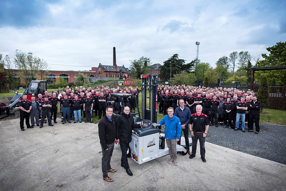 Spezial-Lackierung im Jubiläums-Design und eine feierliche Übergabe im MOFFETT-Produktionswerk in Dundalk (Irland) – So hat die Behrens-Wöhlk-Gruppe ihren neuen, täglichen Begleiter entgegengenommen. Und bei diesem besonderen Exemplar handelt es sich nicht um einen konventionellen Mitnehmstapler, sondern um ein Modell aus der MOFFETT E-Serie. Wie der Name schon verrät, sind alle Mitnehmstapler dieser Serie vollelektrisch und somit emissionsfrei und nahezu lautlos. Mit diesen Eigenschaften eignen sie sich ideal, um Waren von draußen nach drinnen zu transportieren, für den innerstädtischen Einsatz und für nächtliche Lieferungen in Wohngebieten.