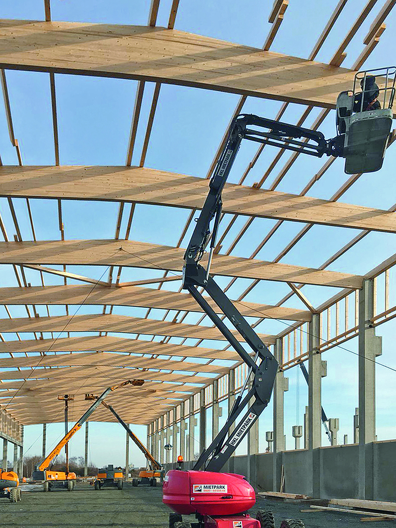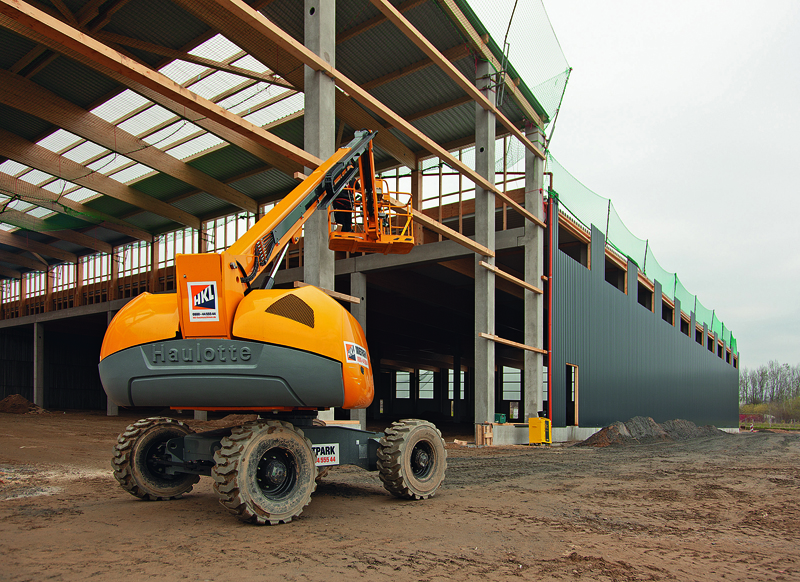 Insgesamt entstehen drei Hallen mit 110 m Länge und 25 m, 50 m und 60 m Breite: eine Durchfahrthalle für Be- und Entladearbeiten, daneben eine Warmhalle und eine Kalthalle. Bei dem Projekt sind neun Arbeitsbühnen und Teleskopmaschinen im Einsatz: Die Haulotte HT23, größte Teleskopbühne im HKL-Mietpark, punktet mit einer Arbeitshöhe von 22,5 m und einer maximalen Reichweite von 18,3 m. Die Haulotte HT16 zeigt sich besonders geländegängig und damit als eine passende Wahl für die Arbeiten im unebenen Außenbereich, ebenso die Haulotte H15 SX, die zusätzlich eine Steigfähigkeit von 45 % besitzt.