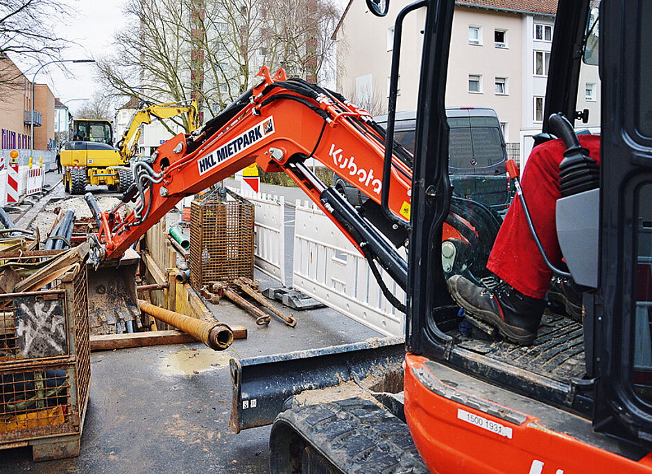 Die 3 km lange Strecke verläuft entlang von Straßen, Wohnhäusern und öffentlichen Plätzen. Um Beschädigungen vorhandener Fremdleitungen für Wasser, Gas oder Telekommunikation zu vermeiden, wurden zunächst Start- und Zielgruben gegraben – mit je 500 m Abstand entsprechend der Länge der Stromkabel, die anschließend gezogen wurden. Zwischen diesen Gruben führte BTW dann Horizontalbohrungen durch und weitete diese für die Verlegung der Schutzrohre auf. Der Kubota-Bagger U48 hielt die Bohrstangen in der Grube vor. Mit kompakten Abmessungen und Kurzheck ist er in Arbeitssituationen wie diesen im beengten Stadtbereich ideal einsetzbar. Sein Load-Sensing-Hydrauliksystem steht für eine präzise Positionierung der Rohre, die stückweise verkontert werden. Beim Ausbau des unterirdischen Hohlraums fielen Feststoffe an, die der Bagger abtrug und in einen Recycling-Container verlud. Ein HKL-Radlader – ein Kramer 5075 – wurde für den Transport von Gitterboxen, Big Packs und Gestängen zwischen den Bauabschnitten eingesetzt. Nach Fertigstellung der Schutzrohre zog Mainova die Stromleitung ein.