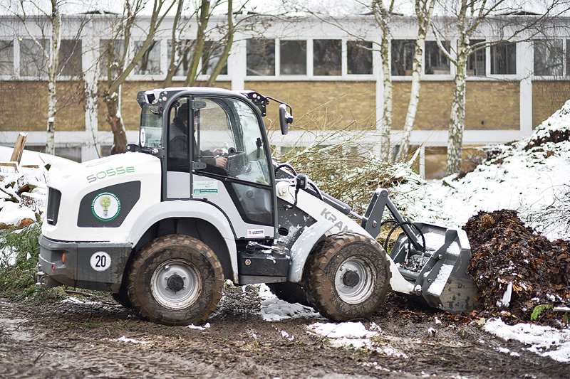 Heute wird der Radlader auf dem Betriebshof von Garden Art für vielseitige Arbeiten eingesetzt. Zweimal in der Woche wendet und zerkleinert der Radlader mit einer Frässchaufel den Boden aus Laub, Astschnitt und Heckenschnitt. Der Boden zersetzt sich über Monate, wird gekalkt und gewässert, damit daraus wiederverwendbarer Kompost entsteht. Zudem belädt die Maschine Container, transportiert und sortiert Paletten. Dabei überzeugt sie durch ihre hohe Nutzlast von 1,75 t sowie durch ihre lange Laufzeit. Der Elektrolader ist bis zu sieben Stunden am Tag im Einsatz, bevor er wieder aufgeladen werden muss.
