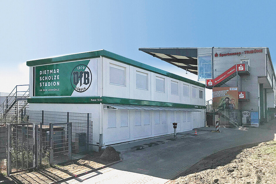 Die Projekte, die HKL begleitet, sind vielfältig: In Lübeck entstand eine zweigeschossige Kita aus 65 Containern mit einer Länge von 35 m und einer Breite von 15 m. In Berlin-Friedrichshain erhielt die LAT Fernmelde-Montagen und Tiefbau eine gänzlich aus Containern bestehende Firmenzentrale mit individueller Ausstattung (das bauMAGAZIN berichtete in Heft 3/22, Seite 110). Der VfB Lübeck erhielt eine 14er-Container-Anlage – inklusive Kassenplätzen, Fanshop, DRK-Rettungsstelle sowie großem Pressebereich. Zusätzlich lieferte HKL WC-Container und separate Kassen-Container.