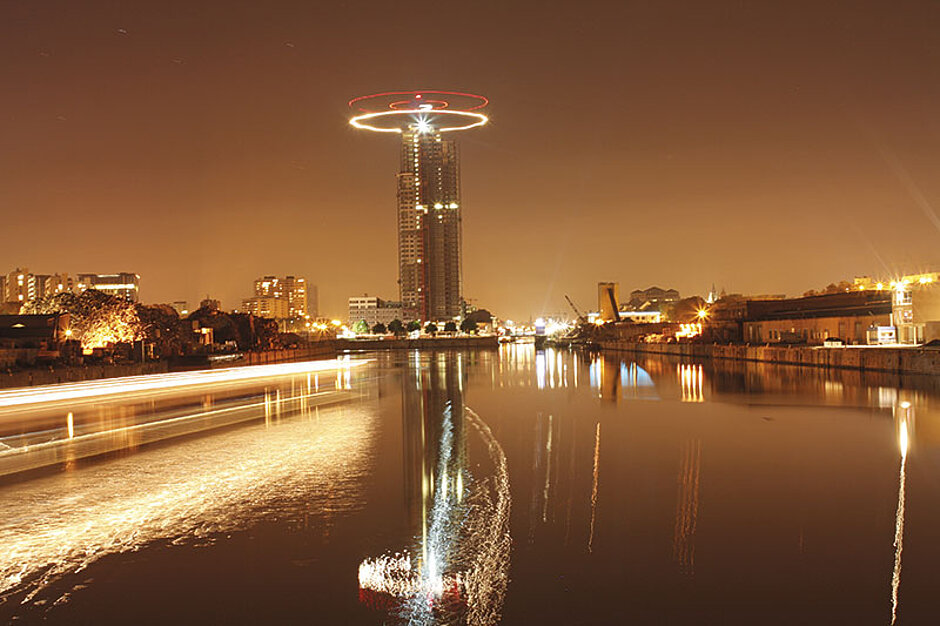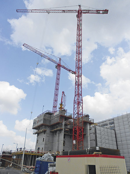 Der erste Wolff 6531.12 mit einer Ausladung von 30 m wurde bereits im Oktober 2011 mithilfe eines 300-t-Mobilkrans auf eine freistehende Höhe von 91,2 m montiert. Von Beginn an auf der Baustelle, wurde er platzsparend im Gebäudefundament verankert.