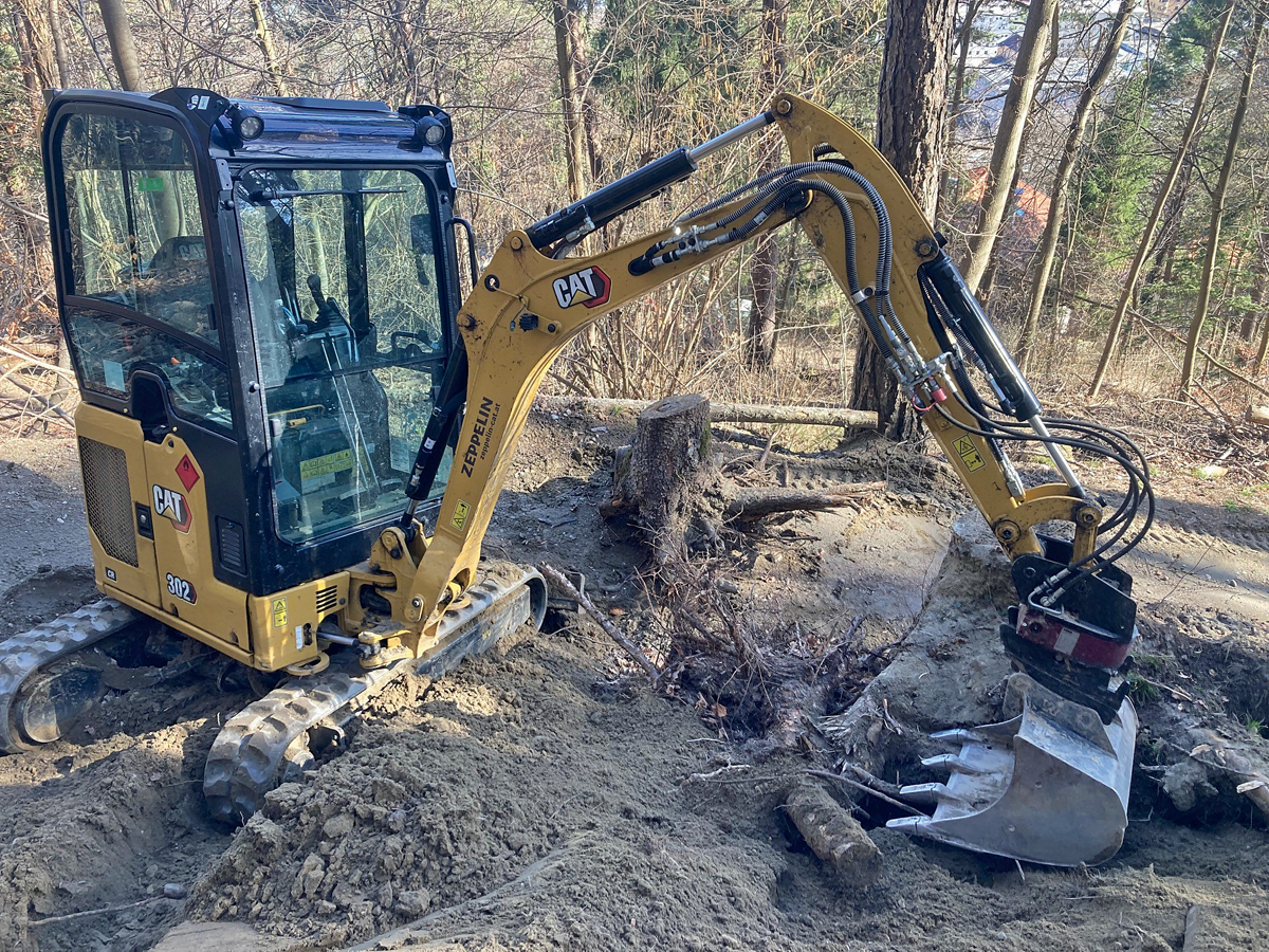 Hierbei zeigt sich ein weiterer Vorteil des RotoTop, wie Benedikt Purner erklärt: »Durch die komplette Drehbarkeit kann man nicht nur zum Bagger hinarbeiten, sondern auch vom Bagger weg. Somit kann man viel einfacher Äste zur Seite schaffen oder den Löffel in jede Richtung bewegen.« Natürlich muss die Detailarbeit hier noch per Hand erledigt werden, diese Handarbeit hat sich aber durch den RotoTop reduziert, wie auch insgesamt der Zeitaufwand für die Baumaßnahme. Benedikt Purner fasst zusammen: »Diese Kombination des CAT 302 CR Next Generation mit dem RotoTop ist die beste, die ich nutzen kann, wenn ich gleichzeitig naturschonend arbeiten will und ständig zwischen Bäumen durchfahren muss. Aufbau und Einweisung durch die Zeppelin-Niederlassung Inzing, für die es der erste 2-Tonnen-Bagger mit einem RotoTop war, und auch die Beratung durch Günter Holp haben sehr gut funktioniert.«s