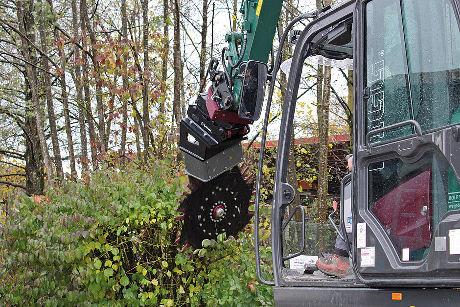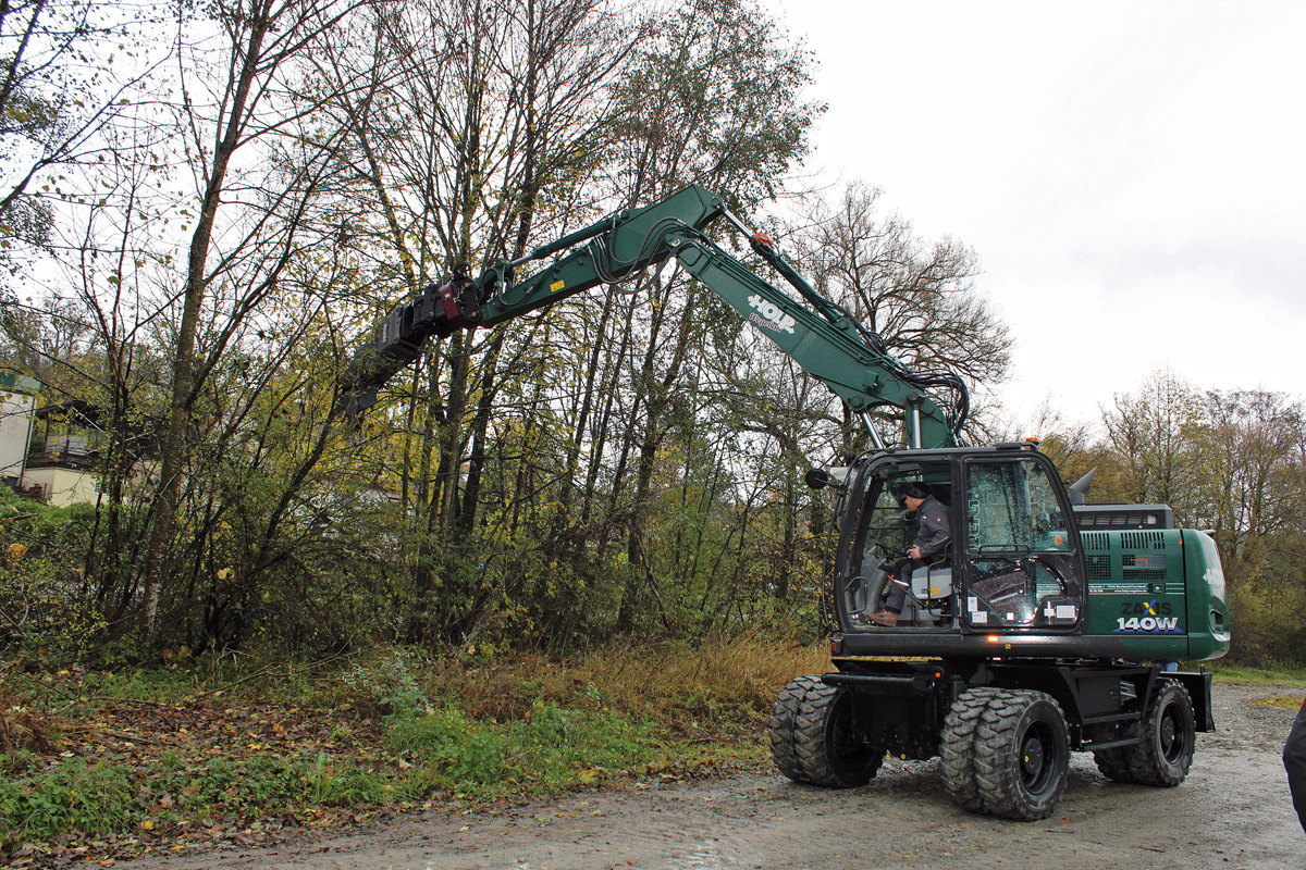 CutWheel wurde als Anbaugerät für Bagger mit einem Einsatzgewicht von 12 bis 15 t konstruiert. Am Bagger kommt CutWheel auf eine Einsatzhöhe von etwa 6 m. Durch die Konstruktion kann die Gegenschneide zudem jederzeit vom Baggersitz aus in die benötigte Stellung gebracht werden. Daher kann beispielsweise an einem Waldtrauf das dünne Geäst wie eine Hecke ganz sauber zurückgeschnitten werden und im nächsten Moment ein 20 cm dicker Ast mit einem sauberen Schnitt abgetrennt werden. Durch diese Vorgehensweise wird nicht nur mehr Wirtschaftlichkeit durch den fortlaufenden Workflow, sondern auch mehr Sicherheit erreicht, wenn der Bediener an vielbefahrenen Verkehrswegen den Bagger nicht verlassen muss, um Schnittrichtung und Dicke zu verstellen, sondern dies ganz bequem von der Kabine aus tun kann.