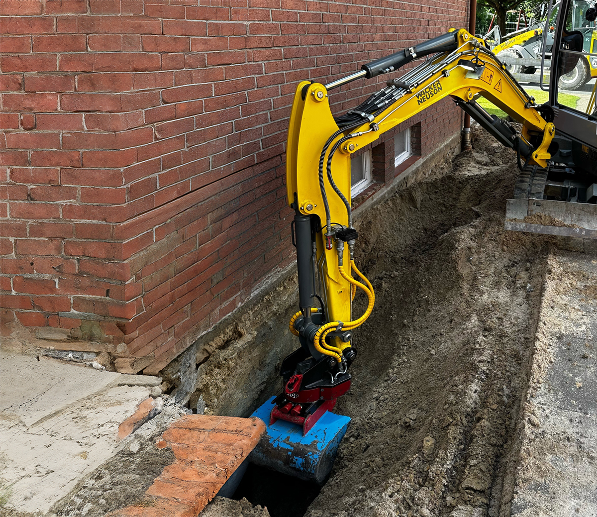 Till Faißt bietet mit einem vierköpfigen Team Pflasterarbeiten für Terrassen, Flächen und Einfahrten sowie Erdarbeiten, Kanalarbeiten, Drainagen, den Bau von Treppen, Zäunen, Einfassungen und vieles mehr für private Kunden, aber auch öffentliche Auftraggeber an. Im Mittelpunkt des Maschinenparks stehen dabei ein Wacker Neuson Minibagger ET18, der mit dem RotoTop ausgestattet ist, sowie einige Radlader von Kramer. Am ET18 wird eine Vielzahl von Anbaugeräten für unterschiedlichste Aufgaben betrieben, bei denen verschiedene Löffelgrößen, Sieblöffel, der Zweischalengreifer, die Pflaster-Verlegezange und weitere oft in schnellem Wechsel zum Einsatz kommen. Unter anderem werden Abbruchschere, Blockbesen, Palettengabel, Sortiergreifer, Fällgreifer und Grassodenschneider am Bagger angebaut, welche sich mit dem RotoTop optimal nutzen lassen.