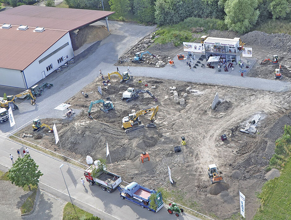 »Die Vorteile unserer Anbaugeräte muss man live, unter Baustellenbedingungen, erleben«, unterstreicht Firmenchef Günter Holp. »Ebenso die einfache Bedienung und die unglaubliche Effizienz bei vielen Arbeiten.« Bei der viertägigen Einweihung mit einem »Tag der offenen Tür« gab es reichlich Gelegenheit dazu. Die Liste der mitwirkenden Bagger von 2 t bis 25 t liest sich wie wie das »Who is Who« der Branche. Von Bobcat, Caterpillar, Kobelco, Kubota, Terex bis Yanmar – alle waren mit einem RotoTop ausgestattet und zeigten ihre Leistungsstärken mit verschiedenen Schnellwechslern wie dreimal OilQuick sowie Variolock und den verschiedensten Anbaugeräten. Vor Ort konnten auch interessierte Fachbesucher die Bagger-/Gerätekombination »RotoTop plus Schnellwechsler plus einem Ammann-Anbauverdichter unter Baustellenbedingungen« testen, ebenso eine Separatorschaufel von Kronenberger und Fräsen von Rokla.