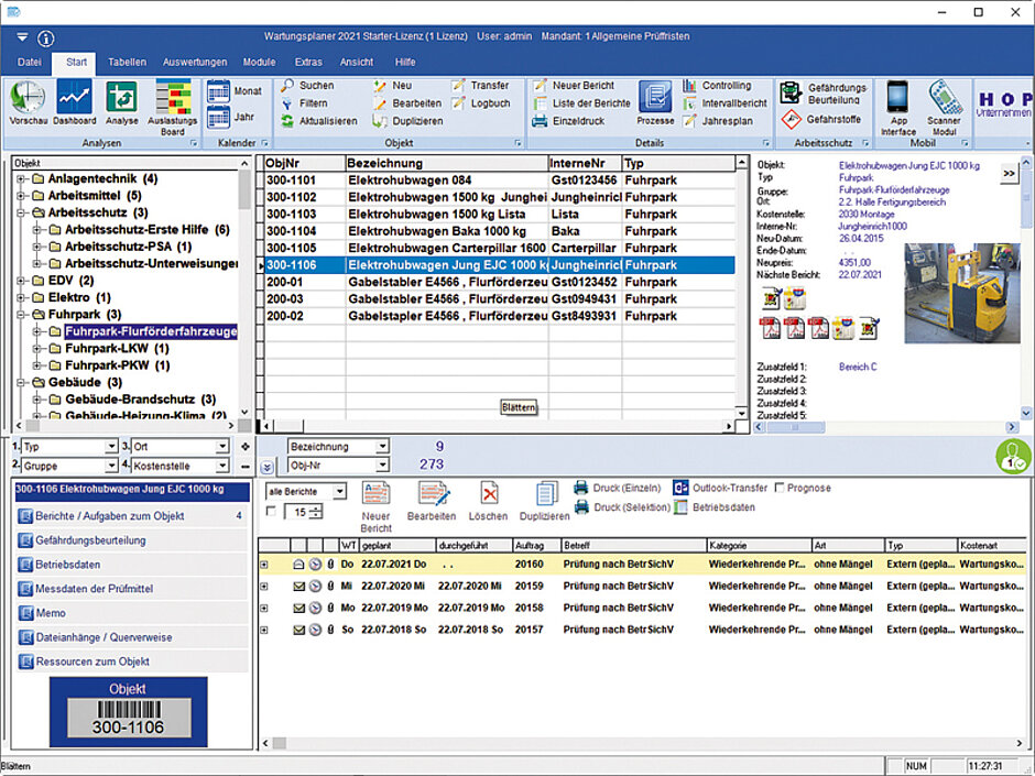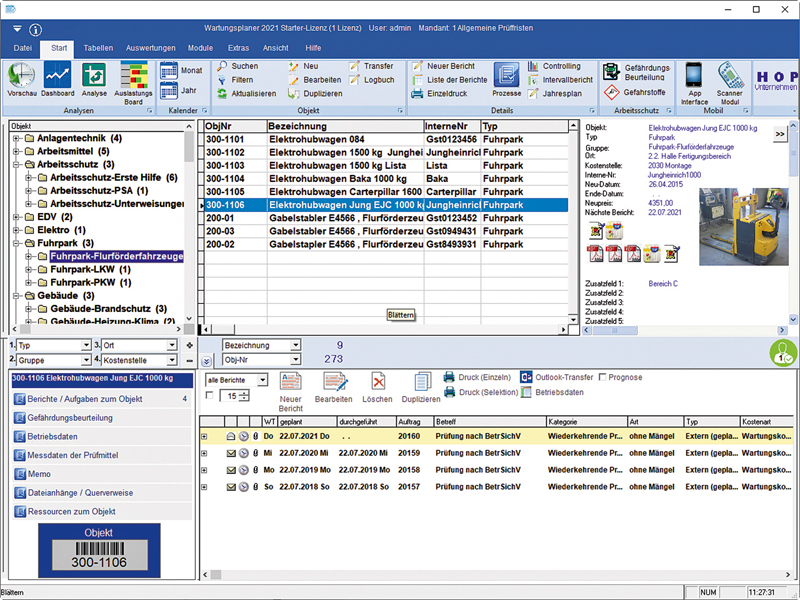 Besser ist ein Tool, das auf die Betriebsmittelwartung zugeschnitten ist und über sämtliche Wartungs- und Instandhaltungsvorschriften sowie einen Kalender zur Planung verfügt. Optimal ist eine Funktion, mit der in Prüfberichten entsprechende Wartungsaufträge generiert werden können. Eine Software für das Wartungs-Management ermöglicht den Fachkräften für Arbeitsschutz und -sicherheit sowie EHS-Managern, per Klick Dokumente zu erstellen, zu archivieren und zu pflegen. Sie erfasst alle Prüfgegenstände und die relevanten Objektdaten. Zusätzlich können weitere Daten wie Bilder hinterlegt werden. Der »Wartungsplaner« der Hoppe Unternehmensberatung beispielsweise ist in den Klassifikationen Wartung, Prüfung, Reparatur, Instandsetzung sowie Prüftermin und Unterweisung unterteilt. Wichtige Instandhaltungskennzahlen werden grafisch aufbereitet und können im- und exportiert werden.
