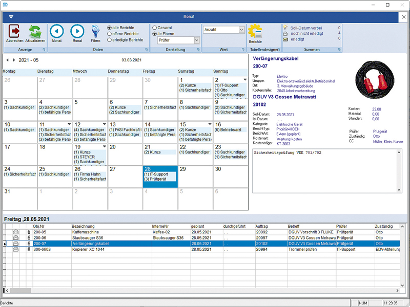Es ist nicht leicht, die diversen Prüfvorschriften und -zeiträume der Geräte, Maschinen und Arbeitsmittel auf dem Schirm zu haben. Zumal die Arbeitsschutzregelungen nahezu sämtliche Betriebsmittel umfassen – nicht nur Produktionsanlagen, sondern auch Türen, Fenster, Leitern und Regale. Die Prüfung von Leitern regelt die Betriebssicherheitsverordnung (BetrSichV), jene von Regalen die berufsgenossenschaftlichen Regeln (BGR) 234 und die DIN EN 15635. Eine Herausforderung sind auch elektrische Anlagen und Geräte. Die Unfallverhütungsvorschrift der Berufsgenossenschaften (DGUV-Vorschrift 3) verlangt, dass diese in regelmäßigen Abständen auf ihre fehlerfreie Funktionalität überprüft werden. Auch die Vorschriften des VDE greifen – sie gelten für alle Geräte mit Stecker, von der Kaffeemaschine bis zum Drucker, von der Kabeltrommel bis zur Bohrmaschine. Hinzu kommen unterschiedliche Prüfintervalle abhängig vom Arbeitsmitteltyp.