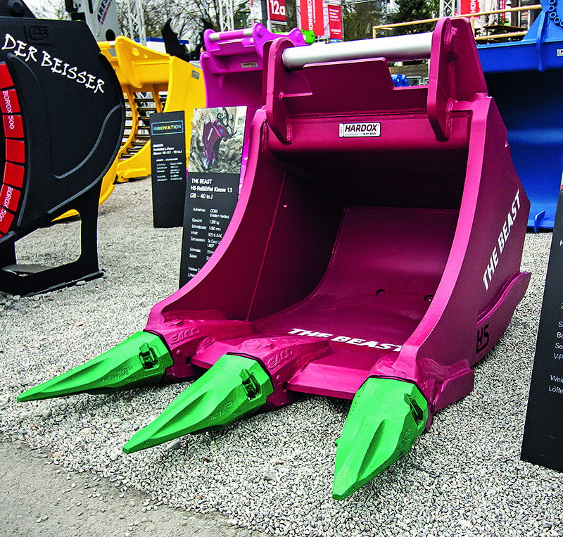 Dank seines Volumens lässt sich mit dem Löffel auch das gelöste Material gleich ohne zeitaufwendigen Anbaugerätewechsel abräumen. Der komplett aus dem verschleißfesten Hardox-Stahl 450 gefertigte Baggerlöffel soll sich nach Anbieterangaben auch selbst unter starken mechanischen Belastungen nur sehr langsam abnutzen.