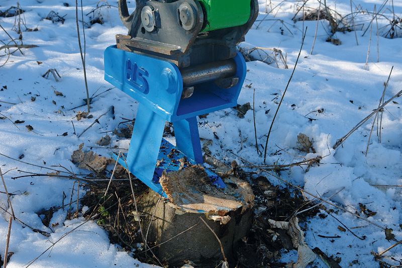 Der Anbaugerätespezialist und Verschleißexperte hat speziell für Rodungsarbeiten seinen Wurzelhobel »HS-Wurzelkönig« entwickelt, mit dem sich Baumstümpfe und Wurzelstöcke samt Seitenwurzeln effizient ohne Fräsen oder weitere Spezialmaschinen roden lassen. Die Hobelfunktion schneidet die Wurzeln in brennholzartige Stücke, die nicht mehr geschreddert oder in der Deponie entsorgt werden müssen. Im Gegensatz zum Fräsen, bei dem Steine oder auch Wurzelstücke aufgewirbelt werden und durch die Luft fliegen, erlaubt der Wurzelhobel auch innerorts neben Gehwegen ein sicheres Arbeiten ohne Personengefährdung. Nebenbei wird der Boden beim Abhobeln der Wurzelstöcke so aufgelockert, dass nach dem Entfernen der Wurzelstöcke gleich mit der Neupflanzung begonnen werden kann. Ebenfalls als nicht zu unterschätzen gilt das geringe Eigengewicht des Wurzelhobels, dank dem er leicht zu handhaben und zu transportieren ist. Für den Anbau ist keine besondere Baggerhydraulik erforderlich. Der Wurzelkönig lässt sich an marktübliche Schnellwechselsysteme, Bagger und Minibagger ab 1,5 t anbauen.