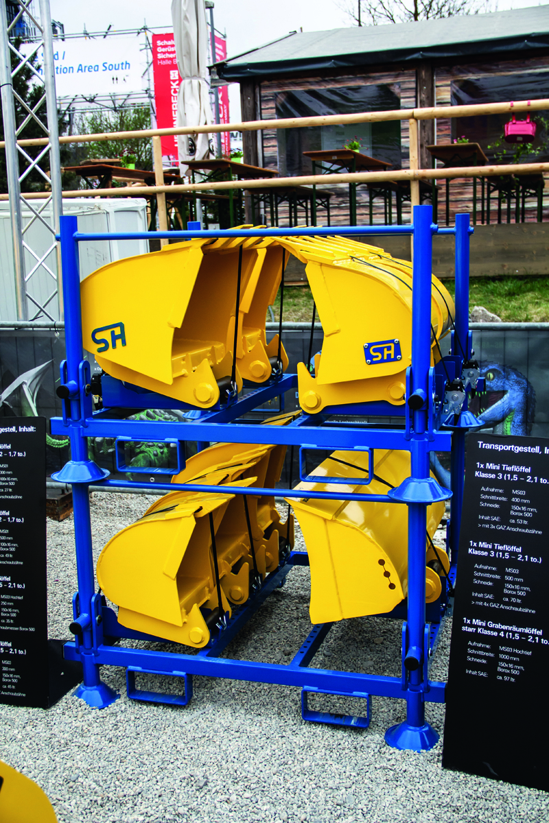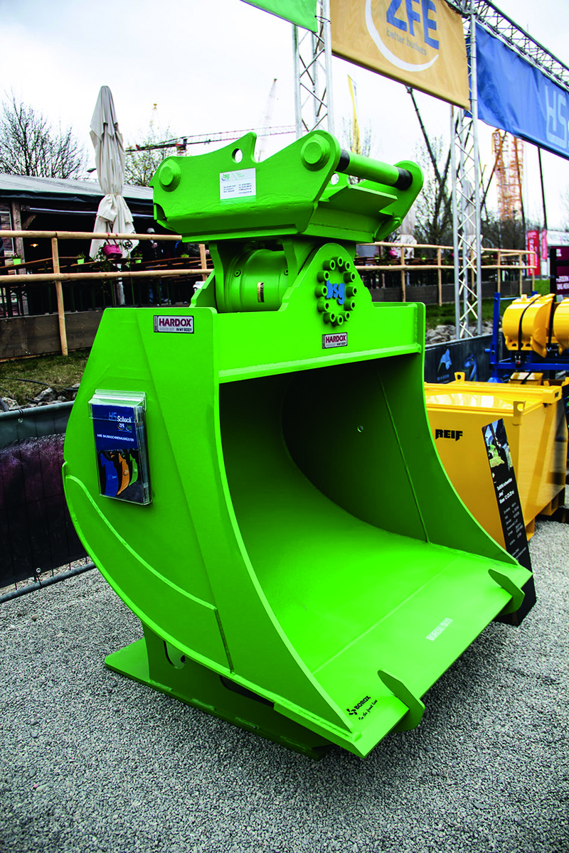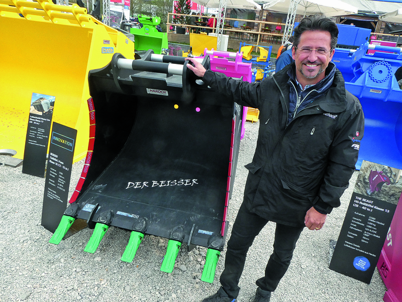 Wenige Tage vor Bauma-Eröffnung hatte die Unternehmensgruppe bereits Grund zu feiern, wurde doch der jüngste Firmenzugang, der Münchener Spezialist für Baumaschinenzubehör, Verschleißteile und Abbruchtechnik, bsg, 40 Jahre alt. Mit rund 25 Mitarbeitern zählt bsg zu einem typischen Mittelständler mit Bodenhaftung. Seit der Übernahme durch die Baumaschinen-Gruppe Ende 2017 haben aus technischer Sicht bereits einige Optimierungen bei bsg Einzug gehalten. So erhöhte sich durch den Einsatz von Hardox-High-End-Stahl anstelle des bisher verwendeten, herkömmlichen ST52, die Leistungsbilanz der Gefäße durch Gewichtsreduzierung bei maximaler Stabilität. Ebenso greift bsg jetzt auf Borox-Messerstahl zurück und hat die Bauformen der Gefäße optimiert: in L-Form für langen Boden und mehr Volumen und in F-Form für besten Freischnitt sowie in Deep-Form, speziell bei bsg gefertigt, mit teilversenktem Drehmotor – letzteren hat bsg auch auf der Bauma vorgestellt. Seitenschneiden werden inzwischen durchgehend aus Hardox anstelle von überdimensioniertem ST52 gefertigt und die Einführung durchgehender Kantteile diente der Stabilisierung der Aufnahmen. Neben dem klassischen Anbaugeräte-Geschäft zeichnet bsg auch für den Ausbau des Mietportfolios in puncto Abbruchtechnik und Spezial-Gefäßen verantwortlich. Mietpark und Abbruchtechnik werden bei bsg aktiv für die ganze Gruppe vorgehalten. §