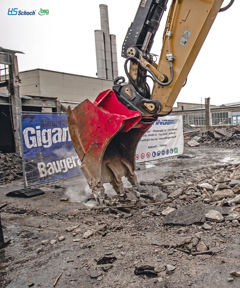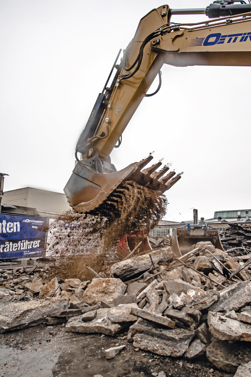 Bei Abbrucharbeiten darf auch ein Sieblöffel nicht fehlen. Auf der Oettinger-Baustelle setzt man auf einen HS-Schoch-Sieblöffel mit Querstreben aus Hardox-Rundmaterial. Der Sortierlöffel ist im Vorjahr mit der Ausrichtung auf eine deutliche Steigerung des Durchsatzes neu konstruiert worden. Dank des Rundmaterials verkantet sich weniger Gestein beim Absieben und der Sortiervorgang zeige sich, so der Hersteller, wesentlich effizienter als bei einer herkömmlichen Bauweise mit Längsgitterstegen. Durch das verschleißfeste Hardox-Rundmaterial werde zudem bei steigendem Durchsatz der Verschleiß minimiert. Zusätzlich sorge ein ESCO-Zahnsystem für ein optimales Eindringverhalten und damit eine Reduzierung der Baggerkraftstoffkosten.