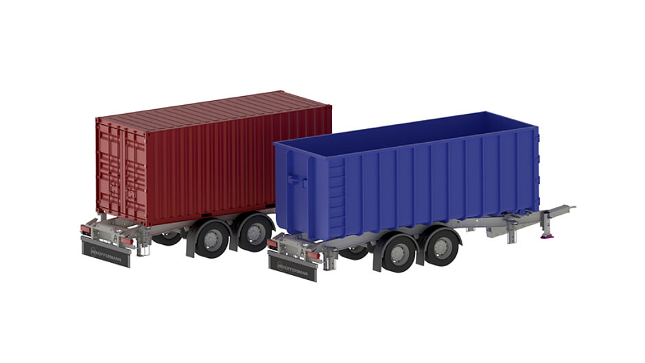 Der Zentralachsanhänger ist wahlweise mit 22,5“ einfachbereiften Markenachsen, Scheibenbremsen und Luftfederung für hohe Ladungskapazität ausgestattet. Für den Ladevorgang eines Abrollcontainers mit dem Lkw-Hakengerät ist der Anhänger für einen sicheren Stand hinten mit 2 Fallstützen und vorne mit 2 windenverstellbaren Pendelfuß-Stützen von Jost ausgestattet. Bei einer Wechselbrücke wird der Anhänger über die Luftfederung absenkt und unter die Wechselbrücke geschoben. Höhenverstellbare Jost Twistlock-Verschlüsse nehmen die Wechselbrücke auf und fixieren diese auf der abnehmbaren Unterrahmenauflage.