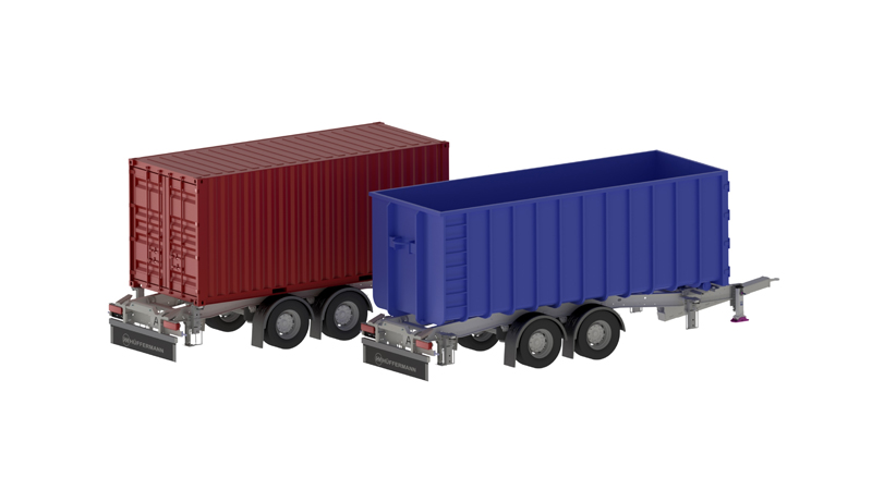 Der neue Anhänger von Hüffermann Transportsysteme schließt eine Lücke in der Transportlogistik, da er sowohl Wechselbrücken als auch Container nach DIN 30722 aufnehmen und transportieren kann. Die Anpassung an die jeweilige Transportaufgabe ist schnell, von Hand und mit Bordmitteln ausgeführt. Das Neustädter Unternehmen bietet auch komplett einsatzfertige Gliederzüge also Lkw mit aufgebautem Hakenabrollkipper für DIN 30722 Behälter und ebenfalls ausgerüstet für die Aufnahme von Wechselbrücken und den Anhänger an. Damit ist es beispielsweise möglich auf einer Hinfahrt Wechselbrücken auszuliefern und bei der Rück- oder Weiterfahrt DIN 30722 Container wie auch gemischte Konfigurationen mit dem gleichen Fahrzeug zu transportieren. Für Speditionen, Recycling- und Transportunternehmen kann auch ein Motorwagen mit abnehmbarem Hakenabrollaufbau die bessere Wahl sein. Das hängt vom Transportaufkommen und den Bedingungen Vorort ab oder wenn unübliche Behälterdimensionen in der Höhe und Länge in der Logistikkette anfallen. Durch eine längenverstellbare Zugdeichsel und seine niedrige Aufbauböhe ist der Zentralachsanhänger kompatibel zu allen am Markt gängigen Abrollbehältern, 20“ ISO-Container und Wechselbrücken.