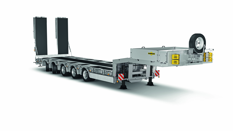Eines der Humbaur-Highlights auf der Bauma ist der Satteltieflader HTS 40K. Zu seinen besonderen Merkmalen gehört die niedrige Ladehöhe von 790 mm, der Korrosionsschutz durch sein feuerverzinktes Chassis und die Ausstattung mit zusätzlichen Zurrpunkten. Der HTS 40K ist mit einem 5-achsigen luftgefederten Tiefladerfahrwerk mit elektronischer Fahrwerksregelung ECAS ausgestattet. Die fünf Achsen setzen sich zusammen aus zwei Nachlauflenkachsen und drei Liftachsen (zwei Kreise). Eine EBS-Bremsanlage in der Konfiguration 4S/3M sorgt für sichere Fahrt, Federspeicherfeststellbremsen wirken im Stand auf die Achsen 1, 2 und 3. Drei Fahrwerksniveaus sind ab Werk definiert: Zum Be- und Entladen wird der Tieflader auf Stützfüße abgesenkt, um optimale Stabilität zu erreichen. Neben dem Standard- gibt es außerdem ein Gelände-Fahrniveau mit mehr Bodenfreiheit, um das Fahrwerk und wichtige Anhängerteile auf unebenem Untergrund zu schützen.