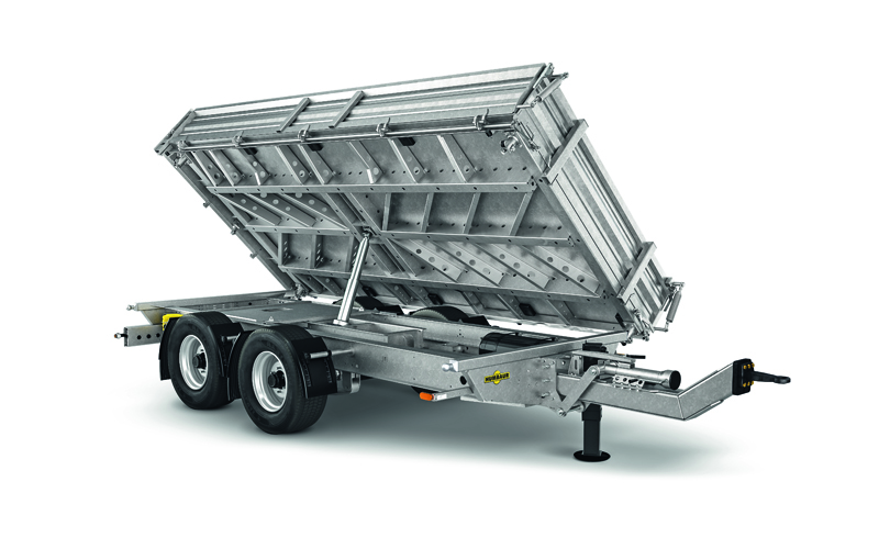 Die Stirnwand des Dreiseitenkippers verfügt jetzt über eine Durchladefunktion, die Heckklappe über eine automatische Verriegelung, sodass sich die Heckklappe beim Rückwärtskippen zum Pendeln öffnen lässt. Der Anhänger verfügt nun serienmäßig über Federspeicherzylinder und eine EBS-Bremsanlage.