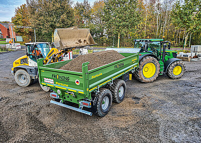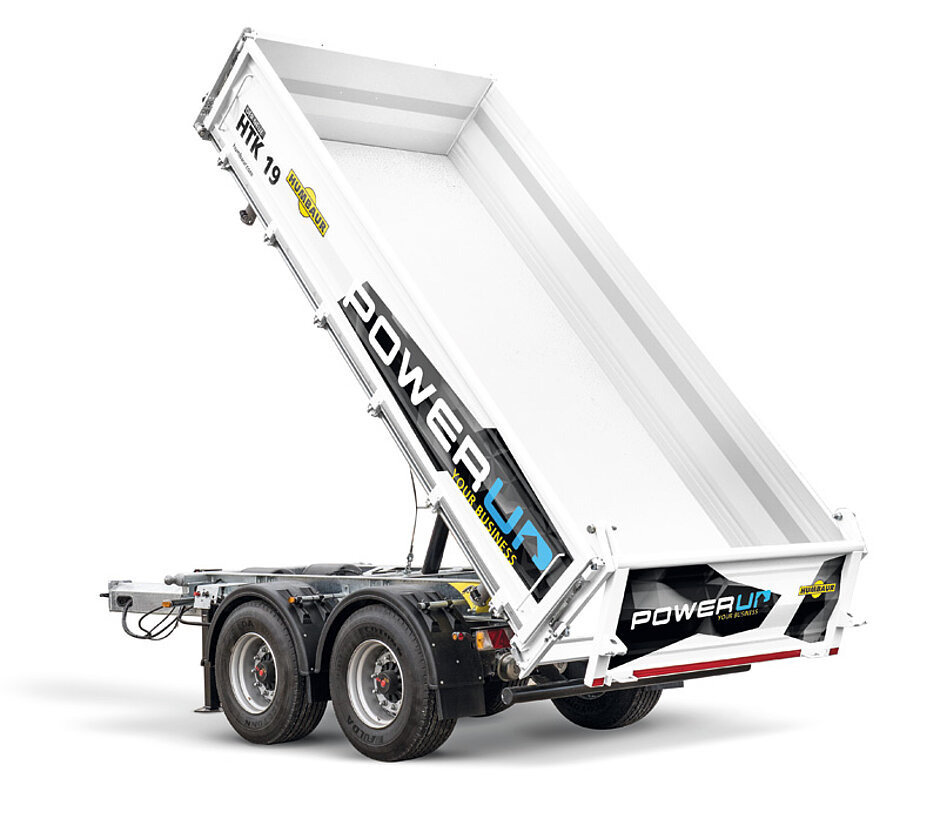 Mit dem Dreiseitenkipper HTK 19 t lässt sich nicht nur Schüttgut wie Kies, Erde, Sand oder Beton aufladen, er eignet sich auch für Palettenware. Der Bauanhänger ist so konstruiert, dass zwei Europaletten nebeneinander geladen werden können. Dank der nutzlastoptimierten Bauweise und des geringen Eigengewichts sind bis zu 15 t Zuladung möglich. Die Ladehöhe kann per Luftfederung niedrig eingestellt werden. Zudem punktet der 19-t-Tandem-Kipper mit abgestimmten Materialkomponenten. Die Hardox-Bordwände, kombiniert mit einem Hardox-Boden, versprechen eine maximale Verschleißresistenz. Alternativ kann der HTK 19 t auch in lackierter Ausführung bzw. mit verzinkter Brücke und einem S400-Stahlboden bestellt werden.