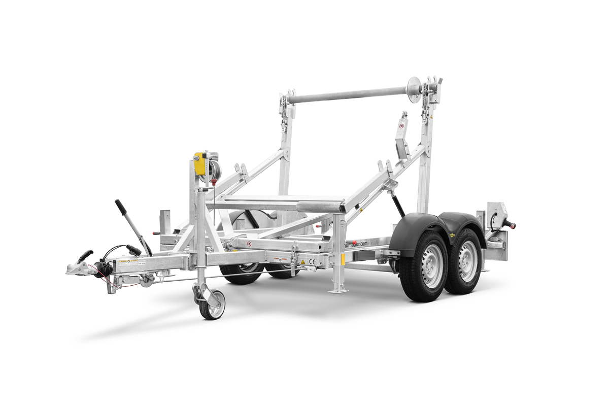 Der Humbaur-Kabeltrommelanhänger KTA kann durch eine einzelne Person bedient werden und will deshalb das Ausrollen oder Aufnehmen von Kabeln zum Kinderspiel machen. Die Möglichkeit zum barrierefreien Einführen der Kabeltrommel verspricht eine zusätzliche Erleichterung. Eine optional eingebaute Bremse sorgt dafür, dass die Kabel nicht zu schnell von der Trommel abgewickelt werden. Neben der Heckabstützung sorgen stabile Teleskopkurbelstützen vorn für sicheren Stand.