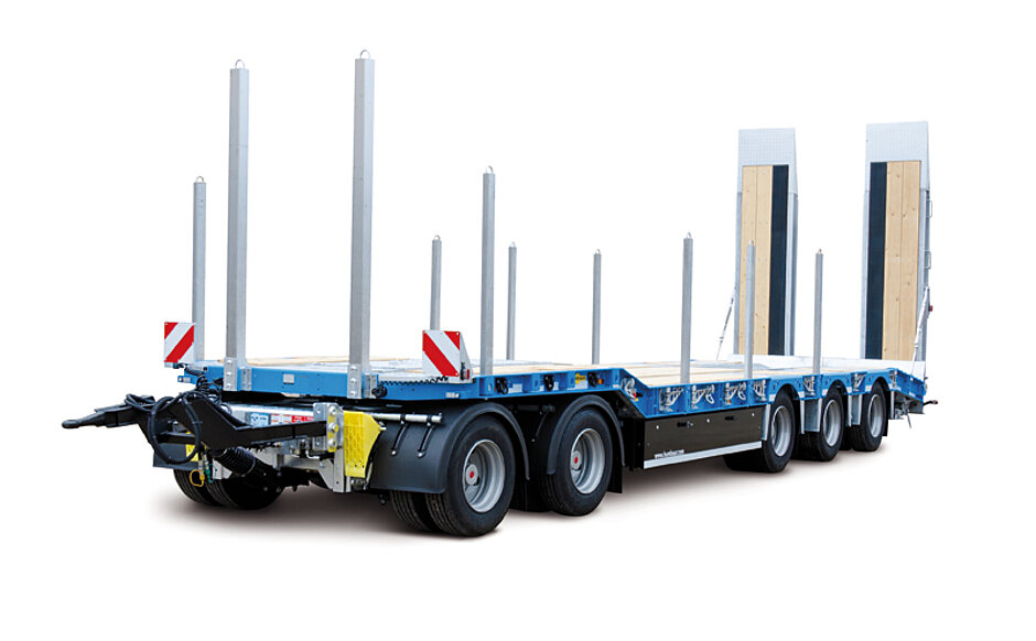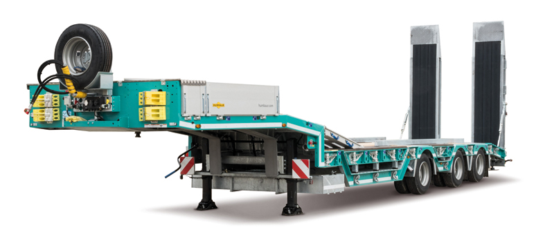 Der HTD 50, das neue fünfachsige Premiummodell der HTD-Reihe, hat eine gekröpfte und durch Luftfederung absenkbare Ladefläche. Für die erhöhte Beanspruchung beim Transport von schweren Baumaschinen verfügt der Tieflader über einen stabilen Haupt- und Außenrahmen. Hier kommen hochfeste Stähle und durchgesteckte Querträger zum Einsatz. Zudem punktet der gekröpfte Tieflader mit einem geringen Eigengewicht ab ca. 9,5 t in der Grundausstattung und einem zulässigen Gesamtgewicht von 50 t mit Sondergenehmigung. Schon die serienmäßigen einteiligen Auffahrrampen mit 3 150 mm Länge, die optional auch hydraulisch erhältlich sind, sichern einen flachen Auffahrwinkel. Für Geräte und Maschinen mit extrem geringer Bodenfreiheit und geringem Böschungswinkel stehen optional geteilte Auffahrbohlen zur Verfügung.