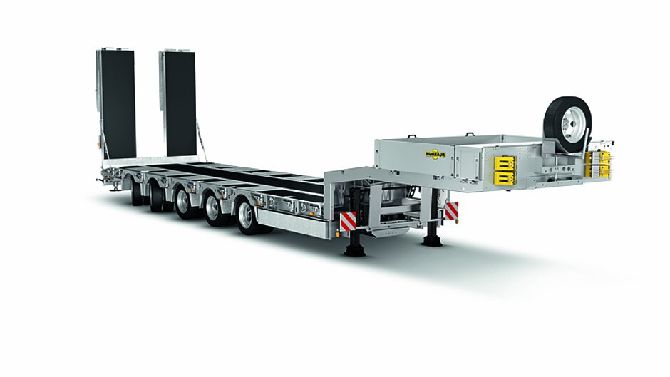 Drei Fahrwerksniveaus sind ab Werk definiert: Zum Be- und Entladen wird der Tieflader auf Stützfüße abgesenkt, um optimale Stabilität zu erreichen. Neben dem Standardfahrniveau gibt es außerdem ein Geländefahrniveau mit mehr Bodenfreiheit, um das Fahrwerk und wichtige Anhängerteile auf unebenem Untergrund zu schützen.