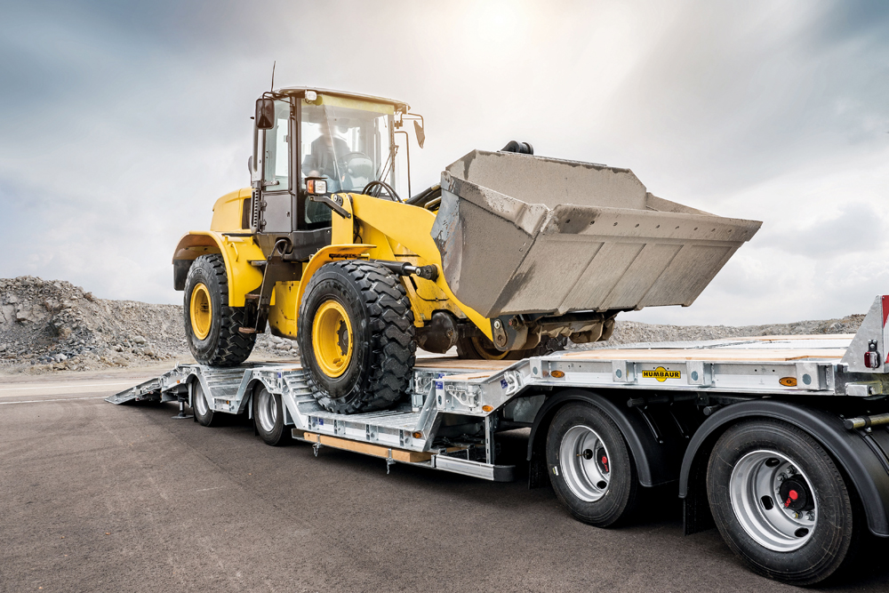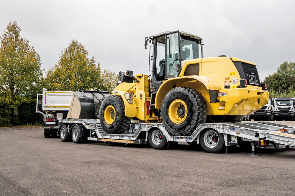 Der Humbaur-Schwerlastanhänger HTD40 mit Radmulden vermag auch Radlader mit langen Radständen von 2 400 mm bis 3 460 mm zu transportieren und greift auf eine massive Schweißkonstruktion aus hochfestem Feinkornstahl zurück. Die Querträger sind durchgestreckt. Dank der serienmäßigen heckseitigen Abschrägung der Ladefläche ist die Ladehöhe besonders niedrig, auch der Auffahrwinkel ist angenehm flach. Der HTD40 bringt ein zulässiges Gesamtgewicht, bei unteilbarer Ladung und mit Sondergenehmigung, von 40 t mit. Damit hat er eine Nutzlast von ca. 32,5 t (Serienausstattung). Die Ladehöhe liegt bei rund 900 mm. Das Tiefbett ist rund 7 160 mm lang und 2 540 mm breit. Das B-Maß liegt bei ca. 11 710 mm. Damit Radlader und Co. auf der Ladefläche gesichert werden können, sind zahlreichen Zurrringe integriert – im Tiefbett vier Paar Zurrringe mit 10 t Zugkraft. Das Hochbett ist mit zwei Paar Zurrringen versehen. Das Außenrahmentiefbett bietet sechs weitere Zurrpunktpaare mit 3 t Zugkraft, auch über den Radausschnitten der 3. und 4. Achse sind vier Paar Zurrpunkte mit 2 t Zugkraft montiert.