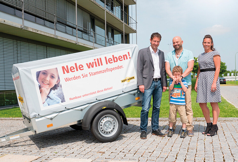 Die Nachricht über die Krebserkrankung des benachbarten Mädchens blieb auch bei Humbaur nicht folgenlos. Entsprechend beteiligte sich der Anhängerhersteller an der Typisierungsaktion und verloste unter allen Teilnehmern, die sich typisieren ließen, einige Preise, u. a. einen Humbaur Steely. Gerhard Kopp, Chemikant von Beruf, kam zusammen mit seiner Familie nach Gersthofen bei Augsburg, um seinen neuen Anhänger abzuholen und war sichtlich erfreut über seinen Gewinn. Der neue Steely soll zunächst beim Entrümpeln und Pflastern zum Einsatz kommen. Kopp wollte sich schon länger typisieren lassen, ausschlaggebend war dann die der Aktion »Nele will leben«, geht doch Kopps Nichte in Neles Parallelklasse zur Schule. Dadurch berührt ihn das Schicksal der Zwölfjährigen umso mehr. Erfreulich war zudem die Nachricht, dass für Nele ein passender Spender gefunden werden konnte. Neben dem Humbaur Steely wurden ferner eine Alarmanlage von Abus, ein Gutschein der Firma Haller, ein Eishockeyschläger der Augsburger Panther und Gutscheine für ein Fitnessstudio und ein Restaurant verlost. Zudem spendeten die Humbaur-Mitarbeiter für die Typisierungsaktion »Nele« 850 Euro.