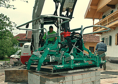 Im Falle des 40/20er-Schwergewichts MultiTec-Aqua von Kann bietet Hunklinger eine Lösung an. Der Verschiebeadapter-plus versetzt diesen schwierigen Stein in Kombination mit einer weiteren Lösung aus dem Hause Hunklinger in den gewünschten Halbversatz. Der geforderte Versatz von 20 cm wird einwandfrei erzeugt. Siebenhütter zeigte sich begeistert, als ihm Lorenz Hunklinger, Geschäftsführer von Hunklinger allortech, die Lösung vorführte. Als zufriedener Pflastergreif-Kunde blieb der neue Pflastergreif P02-2 mitsamt Sonderausstattung im Austausch gegen ein älteres Modells gleich vor Ort. §