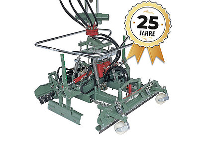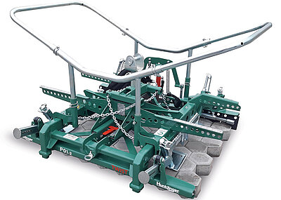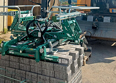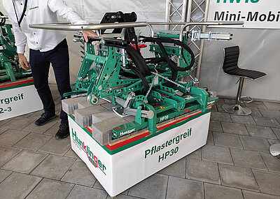 Als fertige Fläche bestechen bei diesem Pflaster der Umweltaspekt und der hohe Verschiebeschutz. Doch dazwischen steht eine besondere Anforderung an die Verlegetechnik: das Verschieben in den Versatz trotz der großen seitlichen Nocken. Da herkömmliche Pflasterzangen diese speziellen Steine nicht verschieben konnten, mussten jährlich viele Tausende Quadratmeter mühsam von Hand verlegt werden. Der Kauf einer Standard-Pflasterzange war für Aumer nicht hilfreich. Auf der zurückliegenden Bauma wurde Martin Aumer schließlich auf den Pflastergreif »HP30« von Hunklinger aufmerksam. Die Verlegezange ist laut Hersteller speziell dafür ausgelegt, stark verschiebesichere Versickerungssteine mit großer Fuge in den Läuferverband zu verschieben und zu verlegen – ein laut Unternehmen »echter Gamechanger« für Aumer.