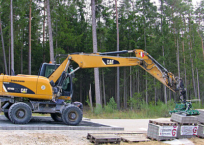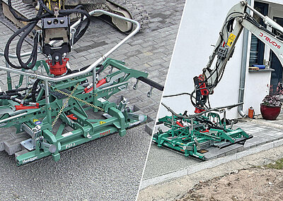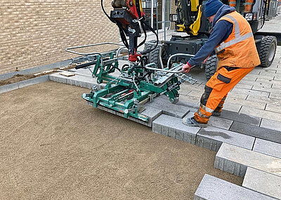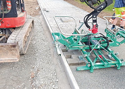 Für den Testeinsatz wurde die »HP30« an einem Ladekran montiert, der sich besonders für kleinere Baustellen eignet. Der Lkw fährt rückwärts an die Einfahrt, sprich Pflasterfläche heran, und der Heckkran reicht mit einer Ausladung von bis zu 14 m in der Regel für die kurze Fläche aus. Zum Vergleich und als weiteren Test wurde der »Tetrago«-Öko-Fugenstein 8,5 mm von Godelmann mit einem »ET90«-Bagger verlegt. Die Kombination aus feinfühliger Steuerung des Baggers und der »HP30« erwies sich hier als äußerst präzise und effizient. Diese Kombination ist für Situationen gedacht, wo der Lkw nicht sinnvoll ist. Martin Aumer, Geschäftsführer der Aumer Bau GmbH, war positiv überrascht: »Die ›HP30‹ hat unsere Erwartungen übertroffen und erleichtert die Verlegung der versickerungsfähigen Pflastersteine enorm. Das spart Zeit und schont die Mitarbeiter. Die ›HP30‹ wird künftig bei jeder passenden Baustelle eingesetzt.«d