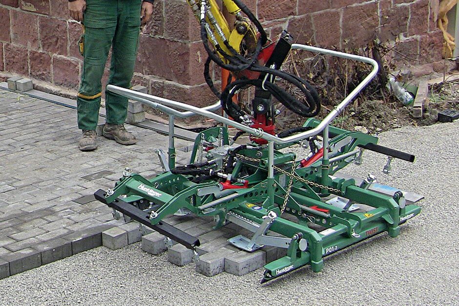 Gerüstet mit diesen guten Erfahrungen musste innerhalb eines Jahres gar das neue Modell P01-2 ins Haus. Der entscheidende Grund zum Aufrüsten war das fehlende Twist-System – diese Hunklinger-Lösung sorgt für sicheres Greifen von in sich gedrehten Steinlagen und zudem für ein stets einwandfreies Planum. Und hier hatte Neumann manchmal Probleme, die Greifbacken der günstigeren Profi-Version des Pflastergreifs berührten unter schwierigen Umständen das Splittbett und verursachten dadurch Unebenheiten. Die Greifbacken der Twist-Variante öffnen dagegen nach oben und stehen so stets für ein sauberes Planum. Für den Neukauf nahm Hunklinger Allortech die gebrauchte P01 in Zahlung. Den tadellosen Zustand der gebrauchten P01 führt Neumann nicht nur darauf zurück, dass er auf seine Maschinen grundsätzlich gut aufpasst, sondern auch auf die einfache Wartung der Hunklinger-Pflasterzange. »Man sieht, dass hier Qualität verbaut ist«, sagt der Pflasterbauer. Und das Tüpfelchen auf dem i ist jetzt der neue DiaVau-Adapter. Dieser besondere Stein ließ sich bisher nur von Hand verlegen. Dank des besonderen Adapters liegt Neumann ein weiteres Mal im zeitlichen Wettbewerb weit vorn – schließlich verlegt er die DiaVau-Steine jetzt auch maschinell mit dem Hunklinger-Pflastergreif. §