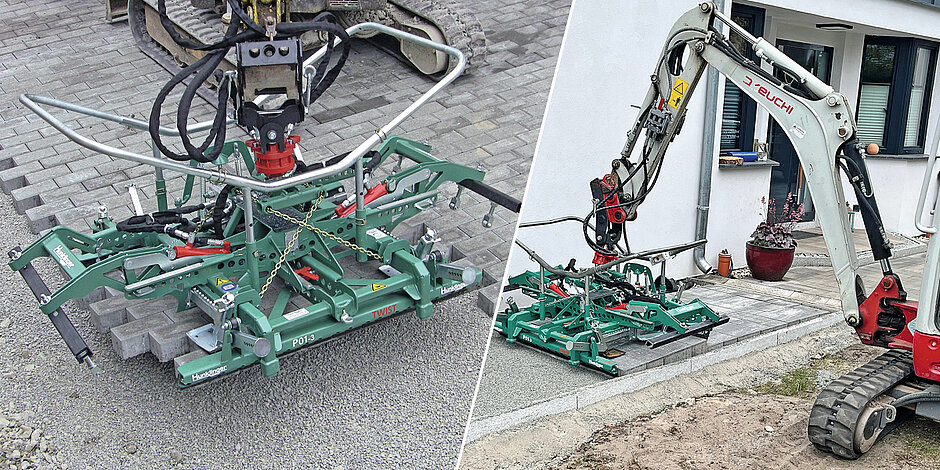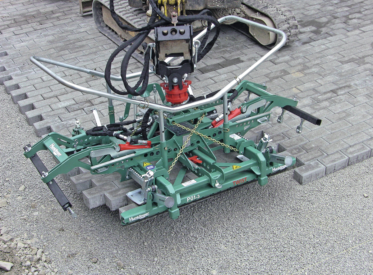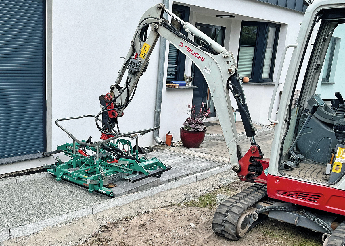 Der Pflastergreif P01-3 ist an Minibaggern ab rund 1,7 t einsetzbar. Er gelte laut Hersteller dank der besonderen Automatiksteuerung für jeden Maschinisten als einfach zu bedienen. Mit nur einem Hydrauliksteuerkreis könne man eine Steinlage ausrichten, verschieben und greifen. Ein zweiter Hydraulikkreis erledigt das 360°-Drehen. Auf diese Weise lässt sich hochpräzise, flexibel und komfortabel arbeiten. Gleichzeitig sorgen Automatiklösungen dafür, dass dem Bediener das Arbeiten grundlegend mit der Maschine vereinfacht wird. Die Steinabdrückeinrichtung ADE unterstützt des Weiteren eine gute Verlegequalität und ein optimales Fugenbild. Der jeweilige Endkunde wird, so der Hersteller, ein sauberes, geradliniges und individuell abgestimmtes Arbeitsergebnis erhalten. Das Einstellen auf Länge, Breite und Höhe der Lage erfolgt werkzeugfrei, was zusätzlich für eine große Zeitersparnis während der Arbeit sorgt und gleichzeitig zusätzlichen Aufwand egalisiert. Die Geräteneigung bestimmt der Maschinist zügig, indem er einfach die Kettenglieder umhängt. Schließlich sind in den Führungsgriffen vom Hersteller zwei Ablagen für die Schnellwechselaufhängung integriert.t