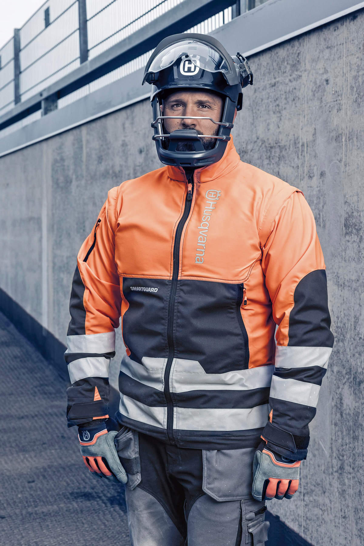 Bei einem Kickback des Trennschleifers sind Kopf, Nacken und Brustbereich besonders gefährdet. Um das Verletzungsrisiko bei Kontakt mit der Scheibe zu verringern, umfasst das neue »SmartGuard«-System von Husqvarna Construction eine verstärkte Jacke sowie einen robusten, aber dennoch leichten Helm. Die Jacke ist für höheren Schutz im Nacken- und Brustbereich aus mehrlagigem Gewebe gefertigt, der Kragen dabei zusätzlich verlängert. Gleichzeitig bietet die gute Passform höchsten Komfort sowie optimale Bewegungsfreiheit und unterstützt so das effiziente Arbeiten mit dem Trennschleifer. Die in den Größen S bis XXL erhältliche Jacke ist mit abnehmbaren Ärmeln, funktionellen Taschen und Belüftung ausgestattet, die Sichtbarkeit entspricht EN20471 Klasse 2.