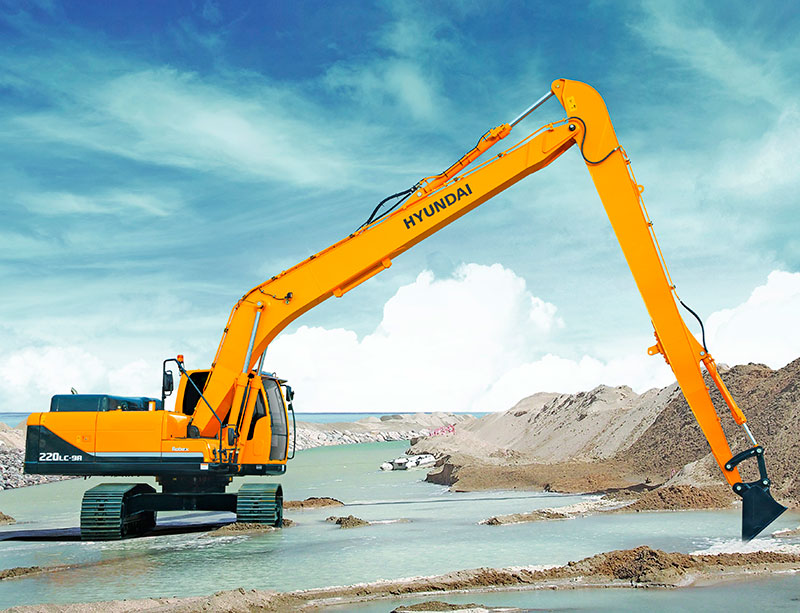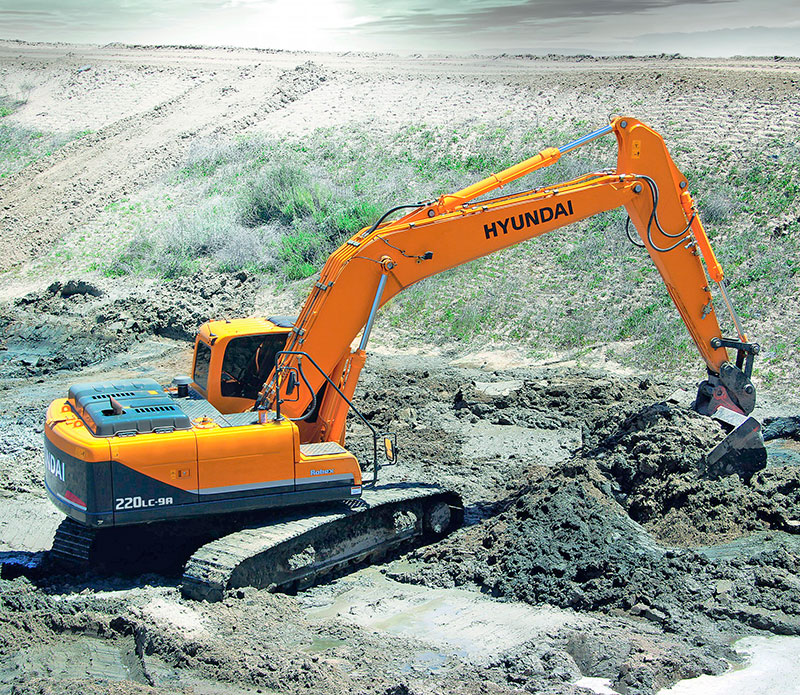 Je nach Breite und Art der Bodenplatten wiegt der neue R220LC-9A zwischen 22 t und 24 t. Typischerweise wird dieser für Tiefbau, Grabungs-, Kanal- und Abbrucharbeiten bestimmte Mittelklasse-Kettenbagger mit Löffeln von 0,5 m³ bis 1,34 m³ ausgerüstet. Hyundai liefert den Bagger wahlweise mit einem 5 680-mm-Monoblock oder einem gleich langen Verstellausleger mit Nackenzylinder auf der Ausleger-Oberseite – besonders geschützt für Verlade- und Hubarbeiten. Vier Löffelstiele von 2 000 bis 3 900 mm passen den Bagger an diverse Einsatzprofile an. Überarbeitete Axialkolben-Verstellpumpen, feinfühlige Bedienelemente und neue Modi wie Auto Boom und Swing Priority für größere Arbeitsgeschwindigkeiten sollen den südkoreanischen Bagger zu einem effizienten Werkzeug auf der Baustelle machen. Die Grabtiefe beträgt bis zu 7 720 mm, die maximale Losbrechkraft 152 kN. Die Ketten haben eine verbesserte seitliche Führung erhalten, sie werden leicht per Fettpresse gespannt. Bei der großflächig verglasten Kabine fallen die schlanken Säulen auf, die die Sicht auf Gerät und Baustelle weiter verbessern sollen. Klimaanlage, beheizbarer Sitz, verstellbare Joysticks und ein Audiosystem mit USB-Anschluss und Bluetooth-Freisprecheinrichtung für das Mobiltelefon sind Standard. Als Option kann der R220LC-9A mit Smart Key ausgestattet werden – damit startet der Bagger per Knopfdruck. Im rechten Fahrerblickfeld befindet sich das Farbdisplay, das über Füllstände der Betriebsmittel, Motor- und Hydrauliksystemdaten informiert und das Serviceinformationen und Fehlermeldungen visualisiert.Zusatzfunktion