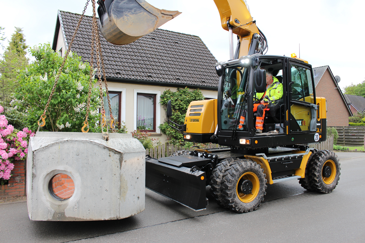 Das Argument, nicht viele Maschinen auf der Baustelle haben zu müssen, sondern mit der einen effizienten Maschine alles zu machen, beschreibt die unterschiedlichen Alleinstellungsmerkmale des City-Baggers aus Dänemark. „Es gibt keinen weiteren Mobilbagger, der gleichzeitig so kompakt, groß und kräftig und vielseitig einsetzbar ist, wie der Hydrema“, meint Werthenbach und führt weiter aus: „Der MX14 beispielsweise ist so kompakt, dass er sich dort drehen kann, wo sich gerade einmal 5 t Minibagger schwenken können und doch holen wir mit dem MX14G bei Bedarf ein 8 t schweres Gewicht aus dem Boden heraus. Gleichzeitig ist die hydraulische Leistung aller MX so kräftig ausgelegt, dass es keine Einschränkungen beim Einsatz mit schweren hydraulischen Anbaugeräten gibt. Insgesamt 407 Liter pro Minute, dabei ein eigenes ZF-Schwenkgetriebe, das mit 88 l gespeist wird, so dass noch 319 l für die Arbeit mit der Maschine zur Verfügung stehen, lassen den Bagger auch bei schweren Arbeiten mit Mulcher oder Ramme nicht lahm werden, sondern er behält seine feinfühligen und flinken Bewegungseigenschaften. Also arbeiten und gleichzeitig fahren, schwenken, und heben sind für den MX18G genauso wenig eine Herausforderung, wie das Heben von extrem schweren Baukörpern. Und je nachdem, was, bzw. in welcher Reichweite das Gewicht gehoben werden muss, müssen die Anbauwerkzeuge noch nicht einmal abgebaut werden. Auch diese Zeitersparnis ist aus Kundensicht beachtlich, denn nicht alle Kunden arbeiten mit vollhydraulischen Schnellwechslern. Und wenn dann erst ein Greifer mühsam abgekuppelt werden muss, nur um ein schweres Gewicht auf der Baustelle zu versetzen, ist das nicht nur beschwerlich und anstrengend für das Baustellen-Team, sondern kostet auch wertvolle Zeit. Mit der Roadshow machen wir es jetzt möglich, all diese Faktoren live zu erleben.“
