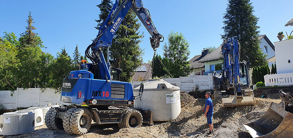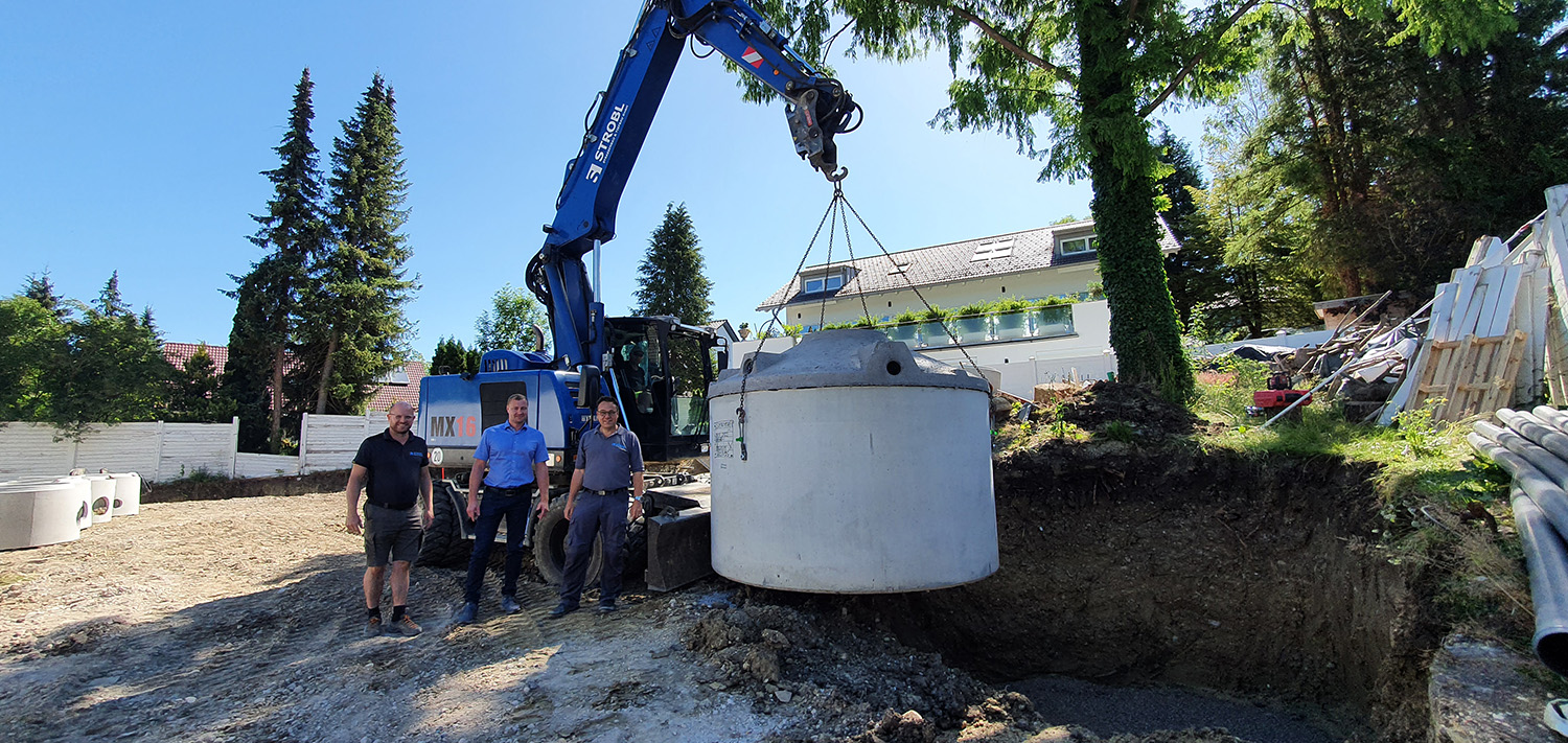 »Es sind die kompakten Abmessungen und die Kraft der Maschinen, die uns für den Einsatz sehr viel Mehrwert bieten«, weiß Michael Strobl. Boris Wolff lädt dazu gleich zu einer Baustellenbesichtigung ein. Hier geht es zwar nicht um einen Rohrbruch-Notfall, aber die Baustelle in Seefeld am Ammersee macht deutlich, wie eng die Baustellen im Umkreis sein können. Auf einem Privatgrundstück, am Ende eine schmalen Sackgasse, muss die Erschließung für die neue Baugrube komplett verlegt werden. Dazu müssen unter anderem zwei 6,5 t schwere Zisternen eingebaut werden. Schon das Entladen und das Verfahren der Monolithe auf dem am Hang befindlichen und schwer befahrbaren Grundstück war eine große Herausforderung. »Nicht auszudenken, hätten wir dafür extra einen Kran bestellen müssen«, malt sich Boris Wolff aus. Bereits die erste Zisterne war schon verbaut und so war man Augenzeuge, wie Sali Meha, der Baggerfahrer das schwere Ungetüm zunächst über den aufgewühlten Boden zum richtigen Platz fuhr und anschließend tief in den Boden versenkte. »Mann-o-Mann, da kriegt man richtig Respekt vor Arbeit, Mann und Maschine. Aber tatsächlich zuckte der MX16 noch nicht einmal am Heck, als sich der schwere Monolith vom Bagger weg in das tiefe Loch bewegte«, lässt es sogar den Hydrema-Fachmann Werthenbach entlocken. »Man hat ja schließlich schon mal was von der Hebelwirkung gehört und wenn man sieht, wie der kompakte MX Citybagger so absolut souverän das Gewicht händelt, ist man immer wieder erstaunt und selbst begeistert von der Ingenieurskunst, die in dieser Maschine steckt.«