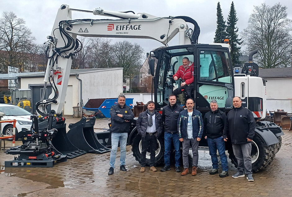 Die Maschine, ein MX16G, u.a. ausgestattet mit OilQuick Schnellwechsler, hochwertige MIG2 Joysticks und Joysticklenkung, Tiltrotator in Sandwich-Bauweise, Kühlbox, 360° Kamera und kompletter LED-Beleuchtung, wurde noch im letzten Jahr bestellt und nun in der Sonderfarbe von Eiffage Infra-Bau feierlich in der Niederlassung Chemnitz übergeben.