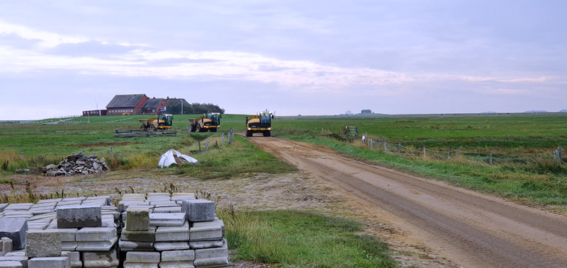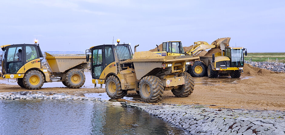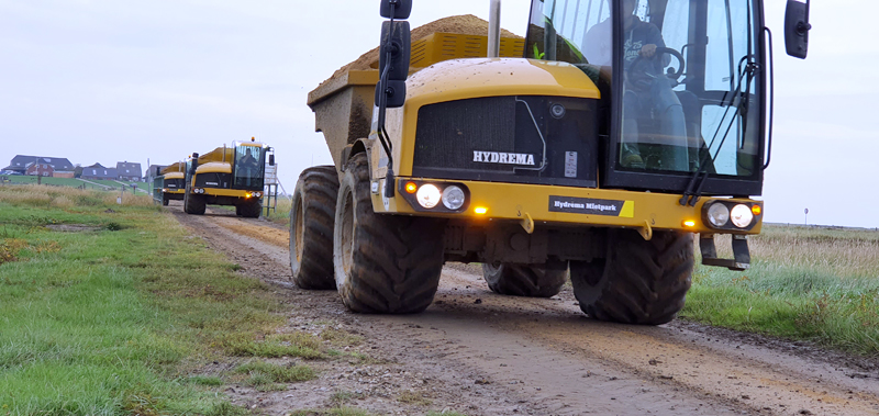 Drei Dumper vom Typ 707G von HYDREMA werden von dem ausführenden Unternehmen dort eingesetzt. Es wird sehr viel Sand benötigt, das mit Schiffen zur Hallig gebracht, dort angeliefert und dann mit diesen Maschinen zur Warft gefahren wird. Der Kern des Plateaus besteht aus Sand, der dann mit einer dicken Kleischicht zur optimalen Flutsicherung umrandet wird. Mit der Zeit wird das Plateau mit Gras überwachsen.