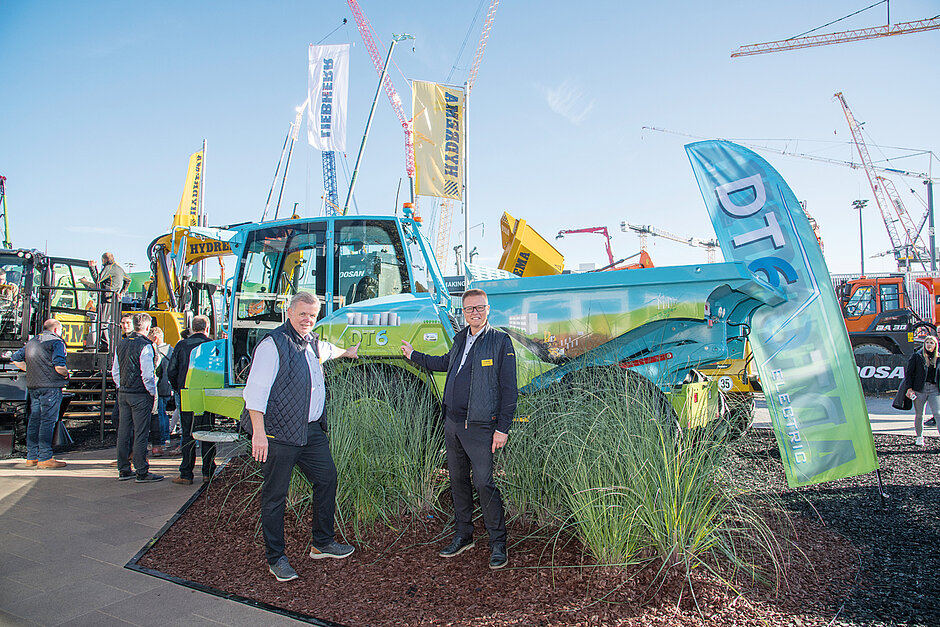 Mit dem neuen DT6 hat ein vollelektrischer Muldenkipper den Bauma-Messestand von Hydrema durch seine zentrale Position, aber vor allem auch durch eine besondere Lackierung dominiert. Das grün-blaue Brush-Painting und die auffällige Begrünung um die Maschine herum sollten unterstreichen, dass bei der Neuheit zu 100 % der Ökologiegedanke im Vordergrund steht.