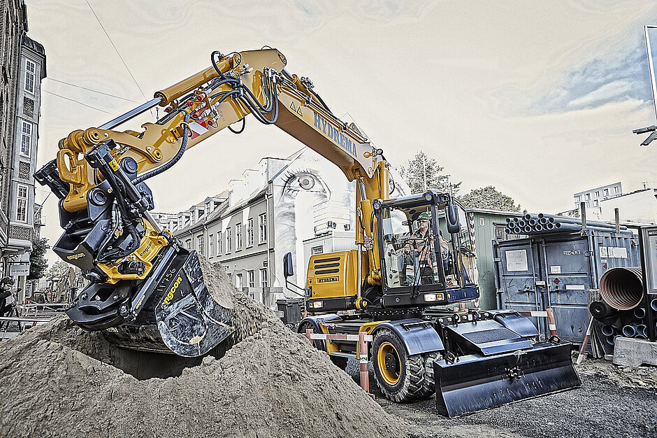 Peter Möller ist stolz darauf, mit dem wohl kräftigsten Citybagger am Markt und dabei auch dem mit Abstand kompaktesten Geräteträger, die Vielseitigkeit in einer beengten konstruierten Baustelle zu zeigen. „Kein anderer Bagger am Markt ist gleichzeitig so kompakt und so kräftig mit gleichzeitig großer Reichweite ausgestattet, wie der HYDREMA MX Citybagger. Wer schweres Material heben oder verlegen muss und sich dabei gleichzeitig in einer beengten Baustelle bewegen muss, der kann diese Arbeiten sehr häufig nur noch mit einem HYDREMA erledigen“, weiß der Unternehmer, der mit seiner jahrzehntelangen Tätigkeit in der Branche authentisch vermittelt, dass er aus Erfahrung spricht.