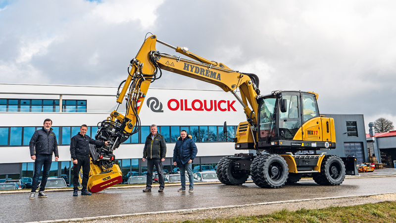 Zusammen mit dem neuen Hydrema-Regionalleiter für die Region Süd-Ost, Arnold Schuh, überzeugte sich Martin Werthenbach im neuen OilQuick-Werk von der Effizienz des Produkts. »Ein Kunde, der sich über Schnellwechsler oder Tiltrotatoren informieren will, findet hier alle Antworten, die er sucht«, so der Hydrema-Vertriebsmann. »Der Kunde, der sich für den Einsatz mit einem Tiltrotator interessiert, soll die Vorzüge bestmöglich kennenlernen. Deshalb werden wir den MX-17 immer mit allen Werkzeugen zu den Baustellen schicken, denn die Flottenoptimierung und damit das Einsparpotenzial ergeben sich, wenn man den Kurzheckbagger mit allen Optionen am Tiltrotator kennenlernen kann. Da gehört neben dem Löffel, mit dem der Aushub gemacht wird, auch die Palettengabel dazu, mit der man sich den Einsatz eines Radladers sparen kann.« t