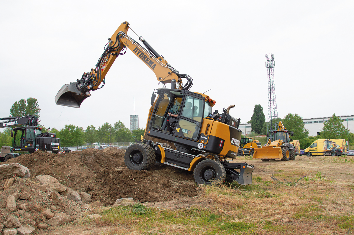 Um den Kreis zu schließen, hatte Hydrema neben den Dumpern auch diverse seiner MX-Citybagger im Gepäck: Ausführungen wie etwa der MX 14G sind besonders kompakt aufgebaut und damit vielseitig einsetzbar. Gerade auf beengtem Raum, so Hydrema, spiele die Maschine ihre Stärken aus. Der kompakte Oberwagen der MX G-Serie hat einen kurzen Hecküberhang von 155 cm im MX 14G und bis max. 173 cm im MX 17G. Komplettiert hat der Hersteller das mit einem kurzen Schwenkradius, gepaart mit einer hohen Reichweite und Grabtiefe. Die Radbagger verfügen ebenfalls über EU-Stufe-V-Cummins-Motoren mit bis zu 128 kW Leistung und einen maximalen Öldurchfluss von bis zu 407 l/min. Hervorgehoben hat Martin Werthenbach außerdem, dass die MX-Modelle mit neuem Bedienpult daherkommen. Um die Maschinen ausgiebig zu testen, stellte Hydrema u. a. verschiedene Sieb- und Brechlöffel, Betonscheren sowie Fräsen, Hämmer und Anbauverdichter zur Verfügung, damit die Besucher die Maschinen in unterschiedlichen Arbeitssituationen kennenlernen konnten. Ausgestattet waren die Citybagger zudem mit Tiltrotatoren von Engcon und OilQuick.